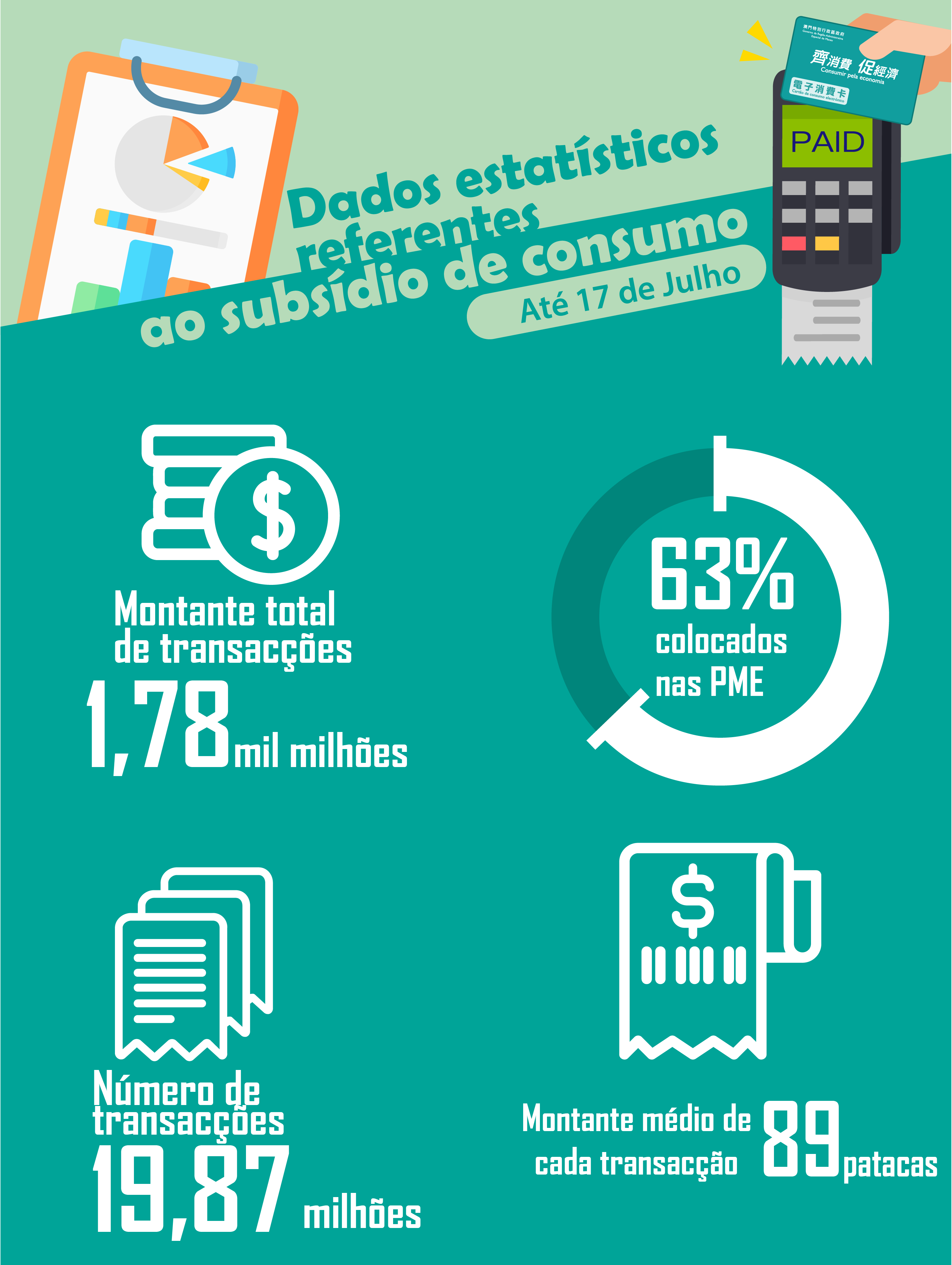 Desde o início da utilização do cartão de consumo da 1.ª fase, em 1 de Maio, até 17 de Julho, o montante total de transacções fixou-se em cerca de 1,78 mil milhões de patacas, representando cerca de 95% do montante total dos cartões de consumo emitidos, tendo sido registadas cerca de 19,87 milhões de transacções. O montante médio de cada transacção é de 89 patacas. De acordo com as estimativas da equipa de investigação e estudo do Instituto de Formação Turística, o benefício global resultante da implementação da 1.ª fase do Plano de Subsídio de Consumo foi de cerca de 1,8 mil milhões de patacas a 2,4 mil milhões de patacas, o que produziu um efeito impulsionador.