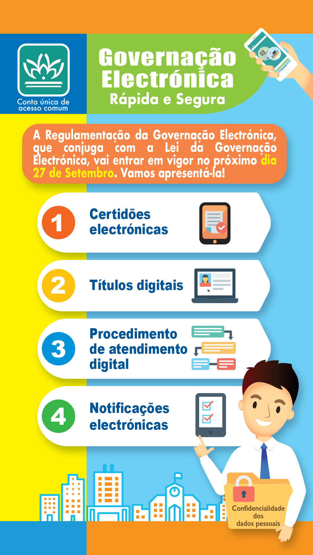 A Regulamentação da Governação Electrónica vem, em complemento à legislação, regular, de forma mais aprofundada, a electronização dos serviços relativamente a documentos, certidões electrónicas, títulos digitais, processos com atendimento digital e notificações electrónicas dos Serviços Públicos, entre outros. Simultaneamente, o Regulamento Administrativo vem reforçar, ainda mais, em especial, a protecção de dados pessoais.