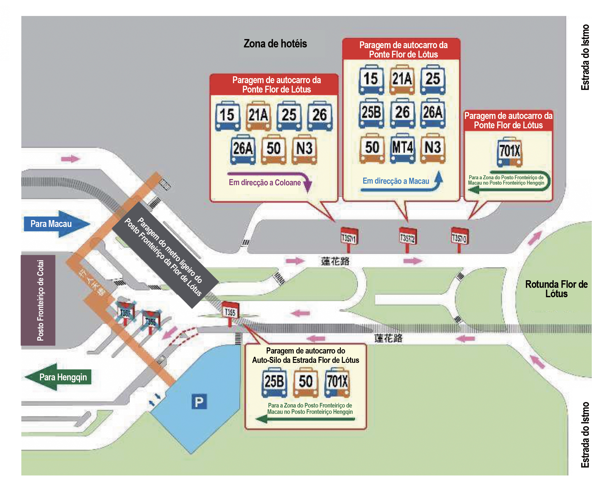 Para facilitar a circulação dos cidadãos e turistas para e do Novo Posto Fronteiriço de Hengqin, a Direcção dos Serviços para os Assuntos de Tráfego (DSAT) avança com a entrada em funcionamento de três novas paragens de autocarro a partir das 14h30 do dia 18 de Agosto. Os serviços das carreiras n.º 25B e n.º 50, actualmente efectivas, serão alargados para a Zona do Posto Fronteiriço da Parte de Macau do Posto Fronteiriço de Hengqin, a partir das 14h45 do mesmo dia. Além disso, a partir das 14h50, será acrescentada uma nova carreira de ligação, a 701X, a qual funcionará 24 horas, entre o Posto Fronteiriço da Parte de Macau de Hengqin, paragem da Ponte Flor de Lótus e a Paragem do Auto-Silo da Estrada Flor de Lótus (vide figura 3). Na Zona do Posto Fronteiriço da Parte de Macau do Posto Fronteiriço de Hengqin será instalada uma paragem de táxi, onde será cobrada uma taxa adicional de cinco patacas por viagem.