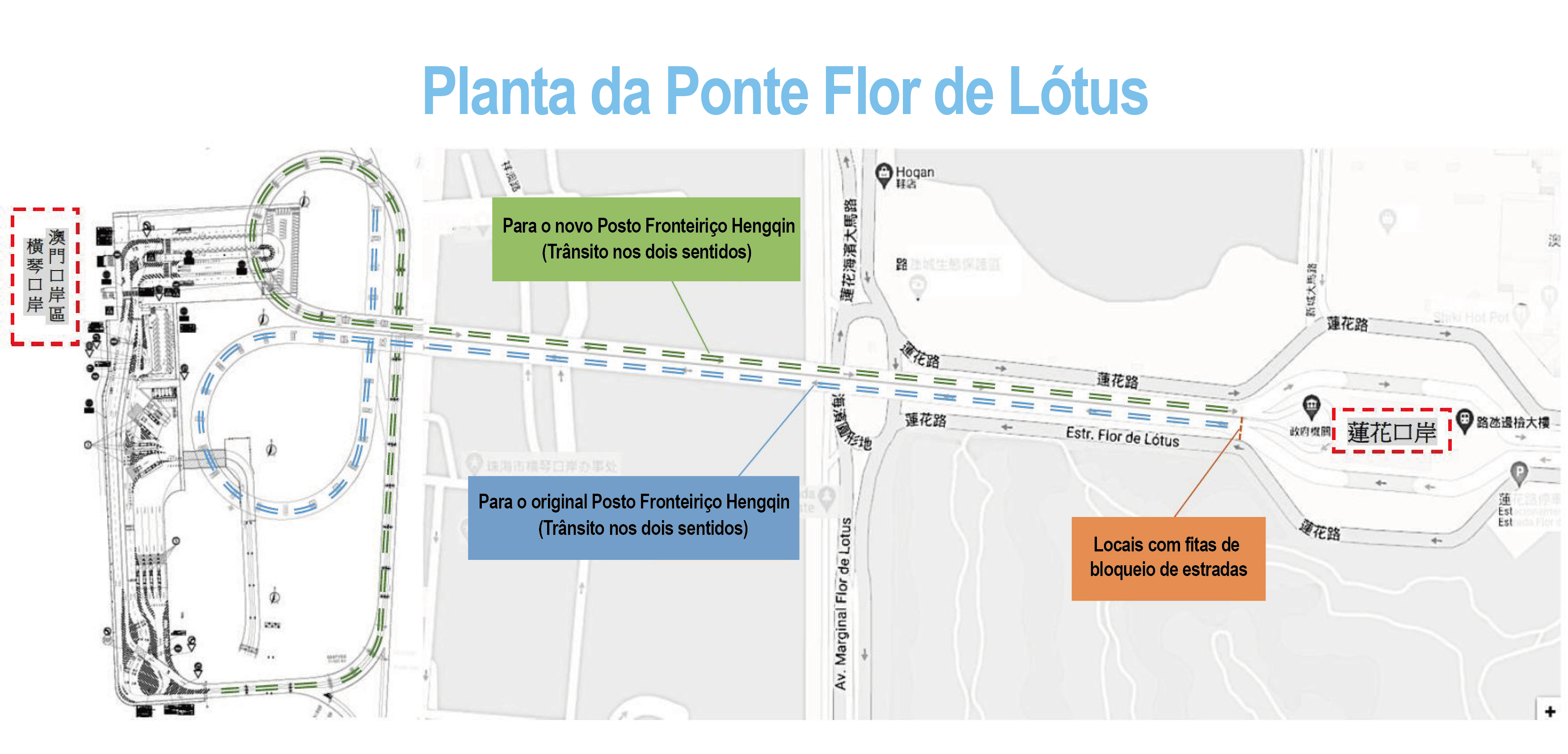 - A partir das 14h30 do dia 18 de Agosto, todos os turistas estão proibidos de entrar na zona de partidas de passageiros e corredores de saída de veículos de Macau ou de Zhuhai dos dois antigos postos fronteiriços. Depois da chegada do último autocarro e outros veículos à zona das entradas da fronteira da contraparte, será encerrada a via da Ponte Flor de Lótus que liga os dois antigos postos fronteiriços (vide figura 1). A zona de chegadas de passageiros e corredores de entrada de veículos, das duas regiões, serão igualmente encerrados logo após o último veículo ou turista finalizarem os seus procedimentos de passagem;