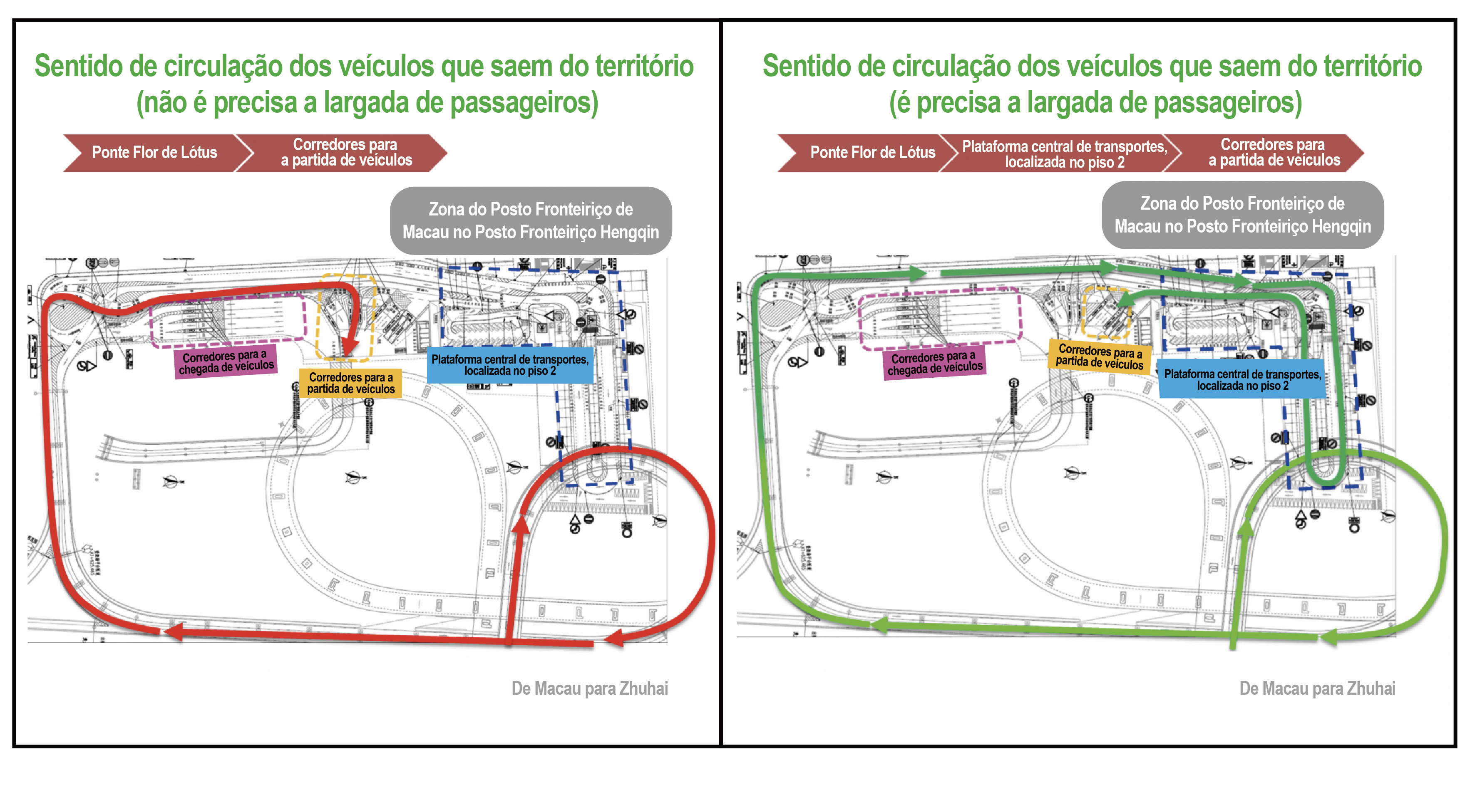 Considerando que os corredores permanentes continuam em obras, após negociações entre as partes, decidiu-se autorizar apenas, nesta fase, a passagem dos veículos com dupla matrícula de Guangdong e Macau, com matrícula de Hengqin e alguns veículos de transporte de mercadorias autorizados (transporte de substâncias perigosas e químicas) nos corredores provisórios. E a fim de garantir a eficácia na passagem fronteiriça, para além do apoio aos indivíduos com necessidades especiais, tais como os portadores de deficiência, mulheres grávidas, crianças de 10 anos de idade ou inferior, idosos de 70 anos de idade ou superior, não será permitida a passagem fronteiriça a turistas em veículos nos corredores de entrada/saída provisórios para veículos. Além disso, os veículos de passageiros que partem de Macau para Zhuhai, devem proceder à largada de passageiros na plataforma modal de transportes, no piso 2 do posto fronteiriço, antes de se dirigir aos corredores das partidas (vide figura 2).
