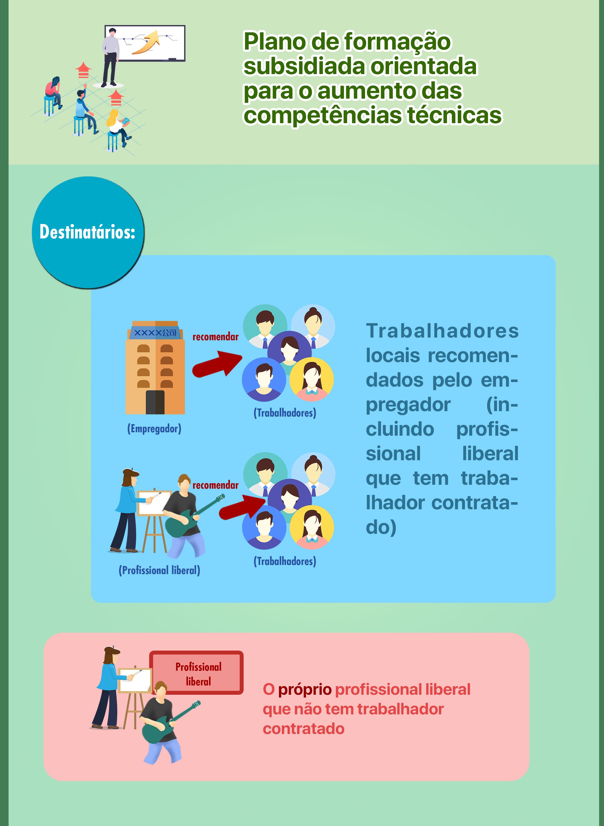 Os destinatários desse “Plano” devem ser os trabalhadores residentes recomendados por operadores de estabelecimentos comerciais ou por profissionais liberais previstos no Regulamento Administrativo n.° 19/2020 (Plano de apoio pecuniário aos trabalhadores, aos profissionais liberais e aos operadores de estabelecimentos comerciais), ou os profissionais liberais sem trabalhadores ao serviço (participação em nome individual). Pretende-se, através desse Plano, aumentar a competitividade no emprego desses indivíduos e a potencialidade de desenvolvimento das empresas.