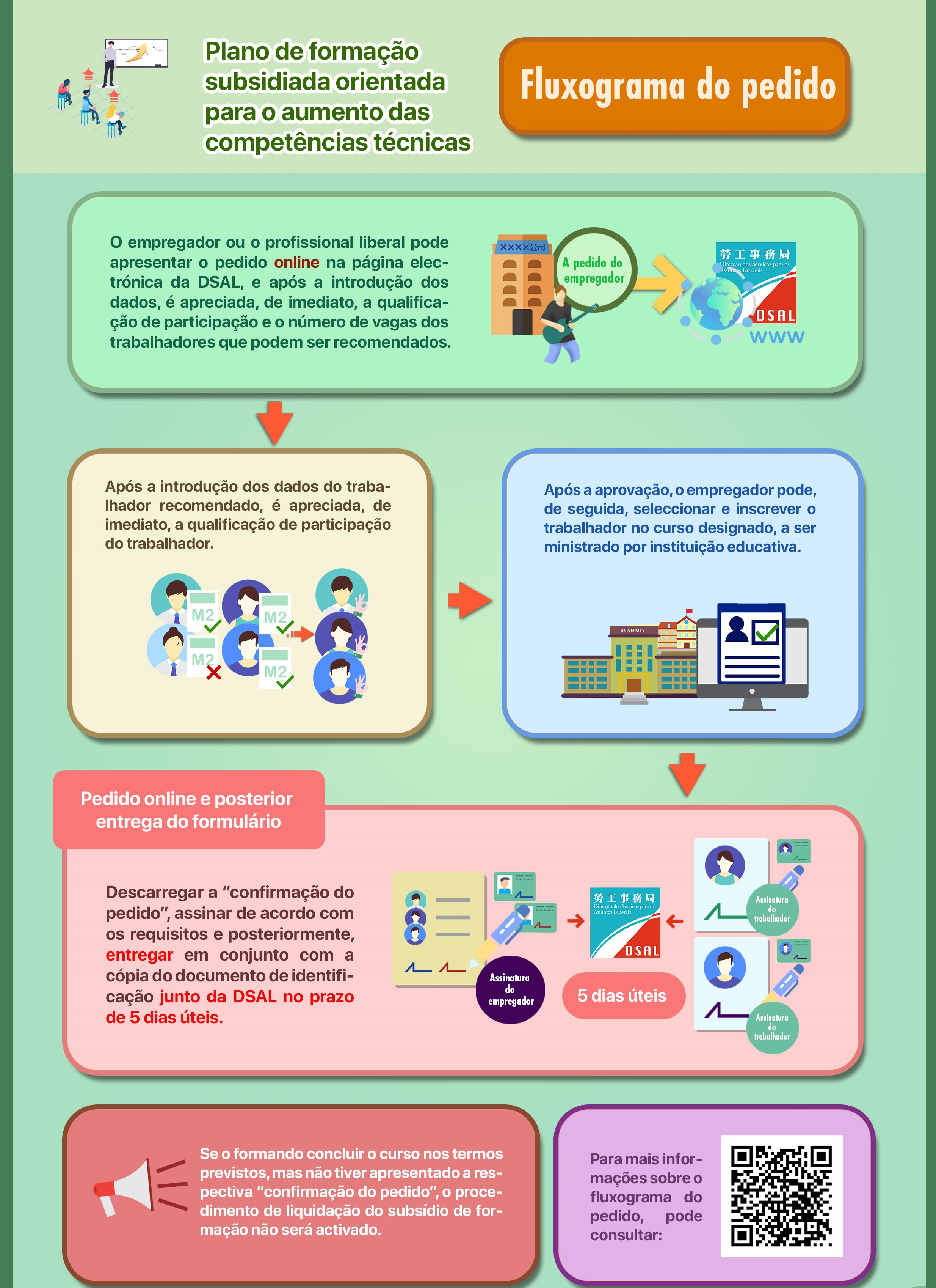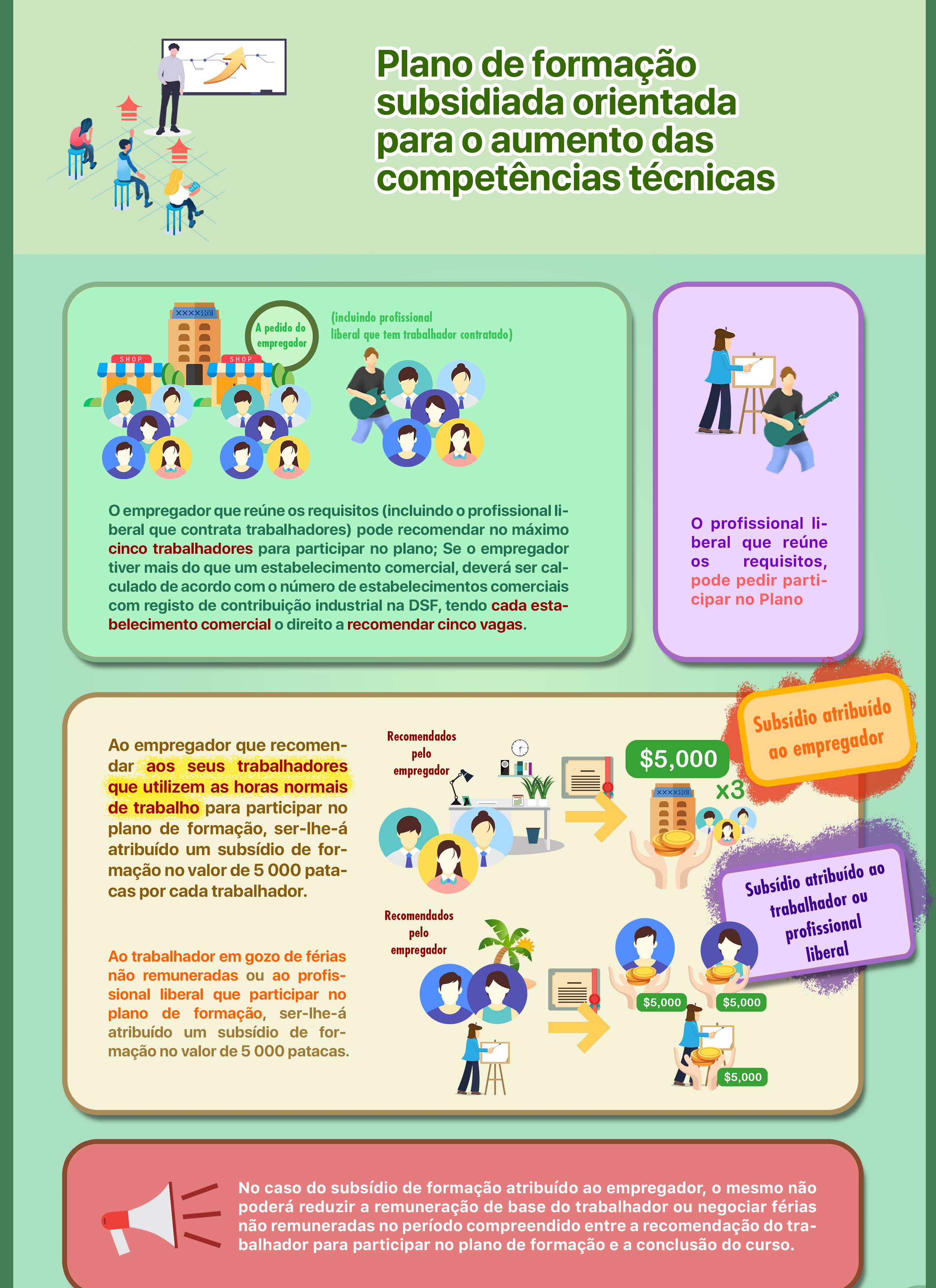 Por outro lado, para ajudar a integração no mercado de trabalho dos residentes com necessidade de encontrar emprego, também é criado o “Plano de formação subsidiada orientada para a empregabilidade” que é composto por duas partes: “Formação de técnicas” e “Encaminhamento profissional”. Os cursos são proporcionados pela DSAL e os formandos que concluírem o curso e colaborarem com o encaminhamento profissional, podem receber até 6 656 patacas. Os destinatários desse Plano são os residentes de Macau que se encontravam em situação de desemprego no dia 1 de Janeiro de 2019 ou em data posterior, por cessação da relação de trabalho, ou os que tenham concluído o curso de ensino superior no ano de 2020 e não sejam trabalhadores por conta de outrem. As inscrições desse “Plano” estão abertas de Setembro.