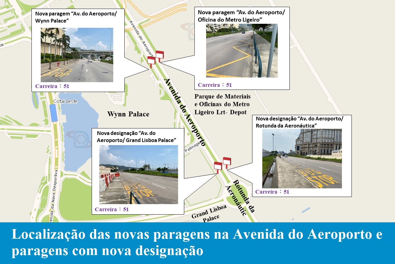 Respondendo às necessidades de deslocação do público, a Direcção dos Serviços para os Assuntos de Tráfego irá criar as paragens “Av. do Aeroporto/ Oficina do Metro Ligeiro”, “Av. do Aeroporto/Wynn Palace” e “Est. da Ponta da Cabrita / Hau Si-1”. As duas primeiras paragens mencionadas situar-se-ão na Avenida do Aeroporto, junto à oficina do Metro Ligeiro, permitindo escala à carreira n.º 51. A paragem “Est. da Ponta da Cabrita / Hau Si-1” localizar-se-á na Estrada da Ponta da Cabrita, junto ao Cemitério Hau Si e servirá para escala da carreira n.º 37. Estas três novas paragens entrarão em funcionamento no dia 5 de Setembro (Sábado).