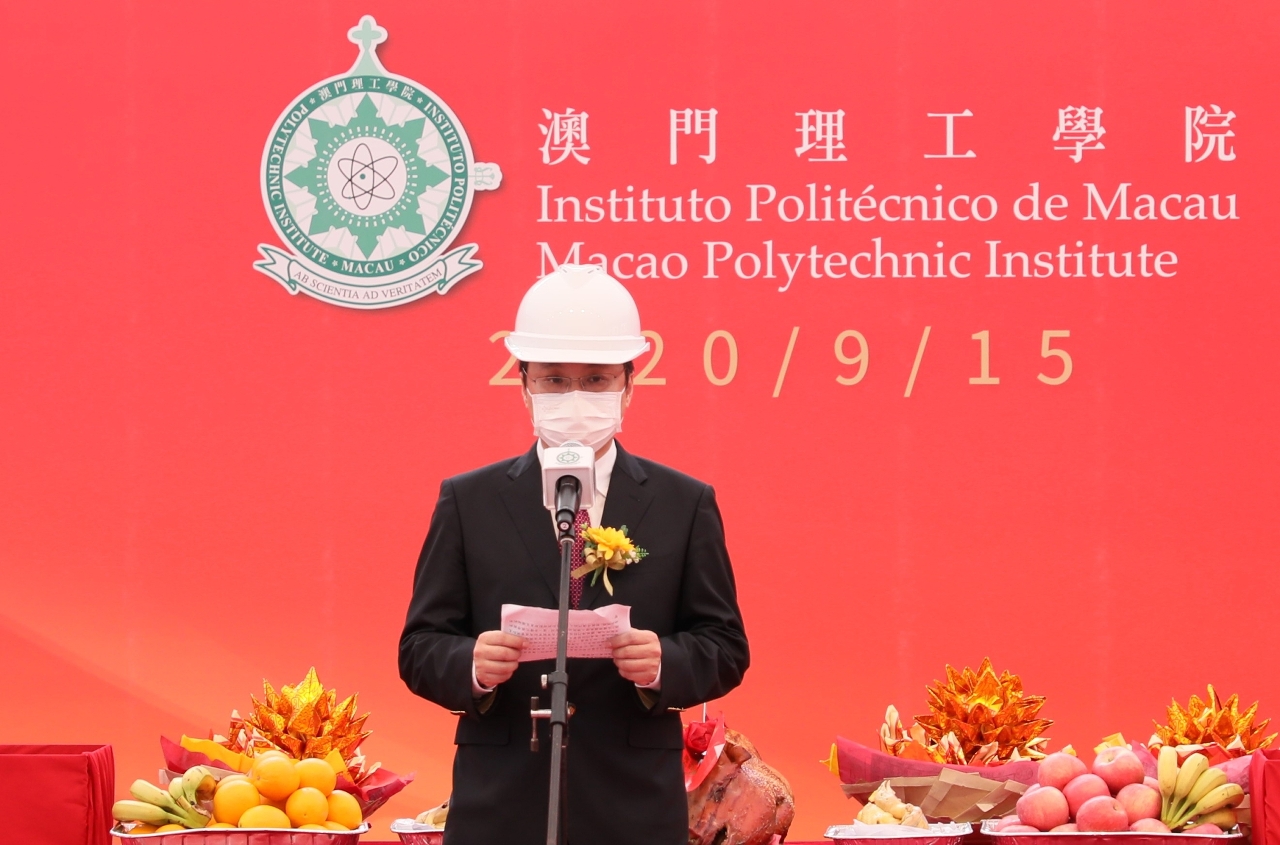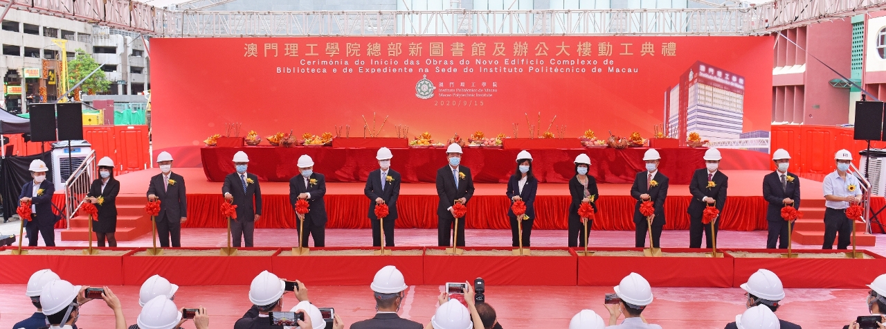 A Cerimónia do Início das Obras do Novo Edifício Complexo de Biblioteca e de Expediente na Sede do IPM teve início às 15:00 horas do dia 15 de Setembro, tendo sido presidida pelo Chefe do Executivo, Doutor Ho Iat Seng, contando também com a participação do Subdirector do Gabinete de Ligação do Governo Central na RAEM, Dr. Zhang Rongshun, da Secretária para os Assuntos Sociais e Cultura, Eng.ª Ao Ieong U, do Vice-Presidente da Assembleia Legislativa, Doutor Chui Sai Cheong, da Directora dos Serviços de Solos, Obras Públicas e Transportes, Eng.ª Chan Pou Ha, do Director, substituto, dos Serviços do Ensino Superior, Dr. Chang Kun Hong, do Presidente do Conselho Geral do IPM, Prof. Doutor Lei Heong Iok e do seu Vice-Presidente Dr. Lok Po, do Presidente do IPM, Prof. Doutor Im Sio Kei, do Presidente da Associação de Estudantes do IPM, Sr. Ng Ka Kei, do Presidente da Associação dos Antigos Alunos do IPM, Sr. Wong U Kei, do Administrador e Gerente-Geral da Companhia de Construção e Obras de Engenharia Tong Lei, Limitada, Sr. Tang Weng Un e do Administrador e Gerente-Geral da Companhia Top Builders International Co. Ltd., Sr. Tang Hon Cheong, e ainda com uma participação de cerca de cem outros convidados, incluindo os membros do Conselho Geral do IPM, personalidades de vários sectores da sociedade, professores, alunos, pessoal administrativo e antigos estudantes do IPM, testemunhando, em conjunto, o arranque deste novo marco do desenvolvimento do IPM.