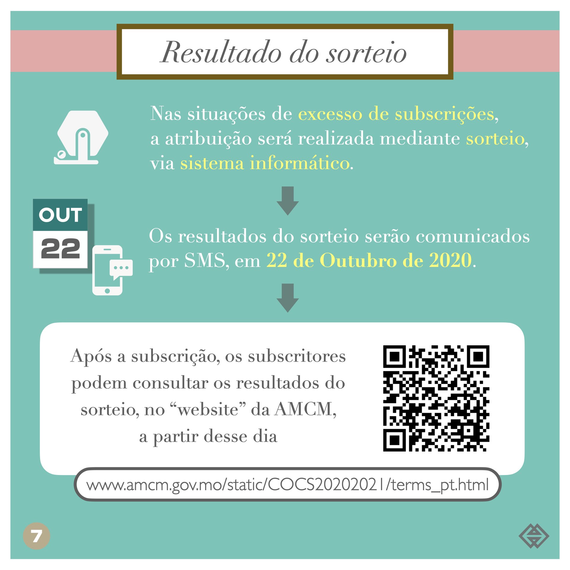 Cada residente de Macau pode apenas apresentar uma subscrição, subscrevendo cada uma das seis moedas comemorativas atrás referidas. Nas situações de excesso de subscrições, a atribuição será realizada mediante sorteio, via sistema informático. Os resultados do sorteio serão comunicados por SMS, em 22 de Outubro de 2020. Após a subscrição, os subscritores podem consultar os resultados do sorteio, no “website” da AMCM ( https://www.amcm.gov.mo/static/COCS20202021/terms_pt.html ), a partir desse dia.