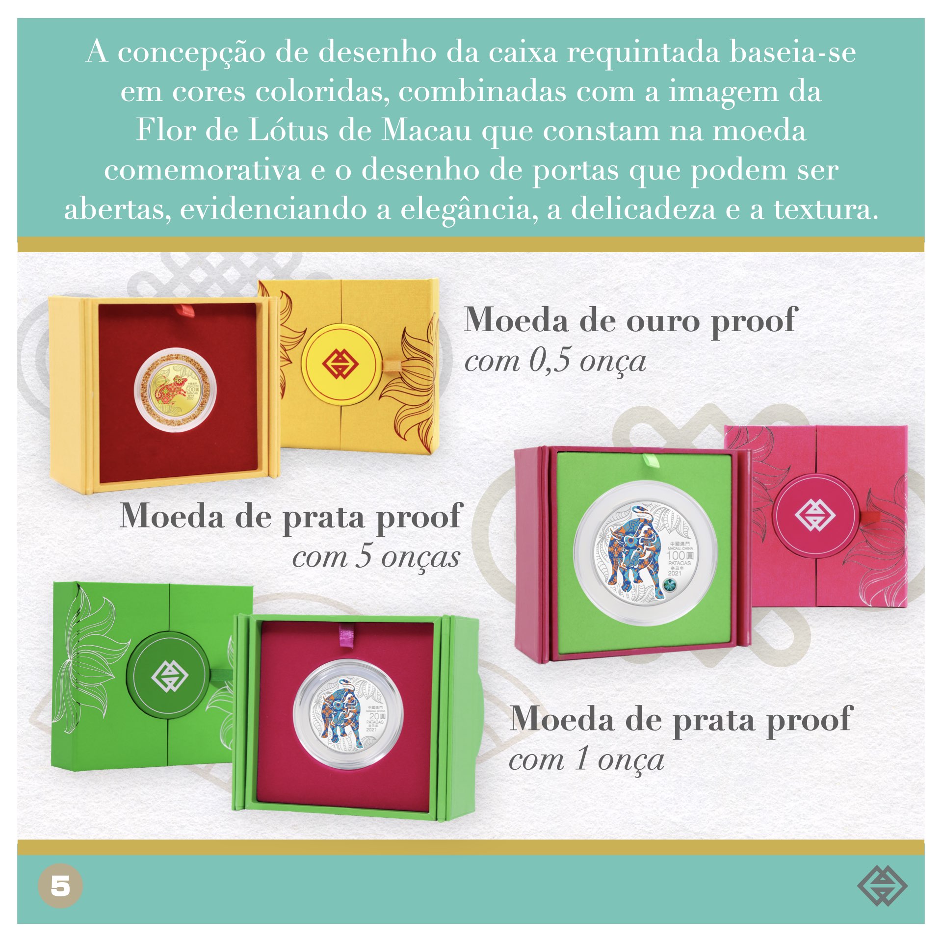 Esta nova série de moedas comemorativas dos Anos Novos Lunares adoptam um novo “design”, sendo que o anverso da moeda comemorativa é constituído por um desenho de um signo zodiacal tradicional chinês relativo ao ano lunar, feito de azulejos desenhados de cores variadas e de estilo português. No reverso da moeda comemorativa, através da nova tecnologia de escultura relevo, esculpe-se um sítio do Património Cultural de Macau. À semelhança da última série, as moedas comemorativas do Ano Lunar do Rato e do Ano Lunar do Búfalo são constituídas por uma moeda de prata proof com 1 onça, uma moeda de prata proof com 5 onças e uma moeda de ouro proof com 0,5 onça (aumentou-se de 0,25 onças para 0,5 onças relativamente à série anterior). Os preços dos três tipos de moedas comemorativas são1.380 patacas, 8.800 patacas e 16.800 patacas, respectivamente.