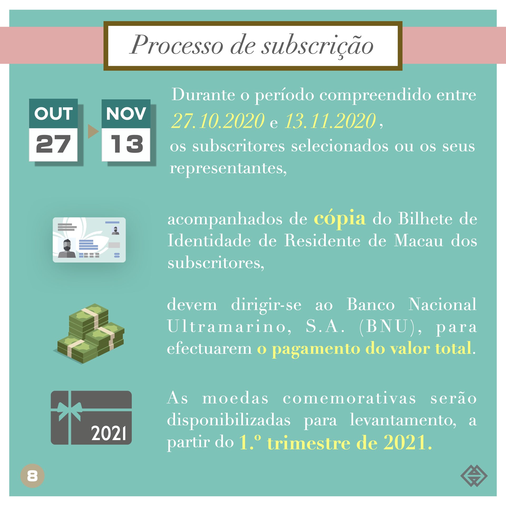 Os titulares de Bilhete de Identidade de Residente Permanente ou Não Permanente válidos, com idade superior a 18 anos, podem subscrever as referidas moedas comemorativas, das 9:00 horas do dia 28 de Setembro de 2020 às 18:00 horas do dia 16 de Outubro de 2020, através do “website” da AMCM ( https://www.amcm.gov.mo/static/COCS20202021/terms_pt.html ). Durante o período de subscrição supramencionado, será instalado um balcão, no “lobby” da AMCM, ao serviço dos cidadãos idosos que necessitem de assistência.