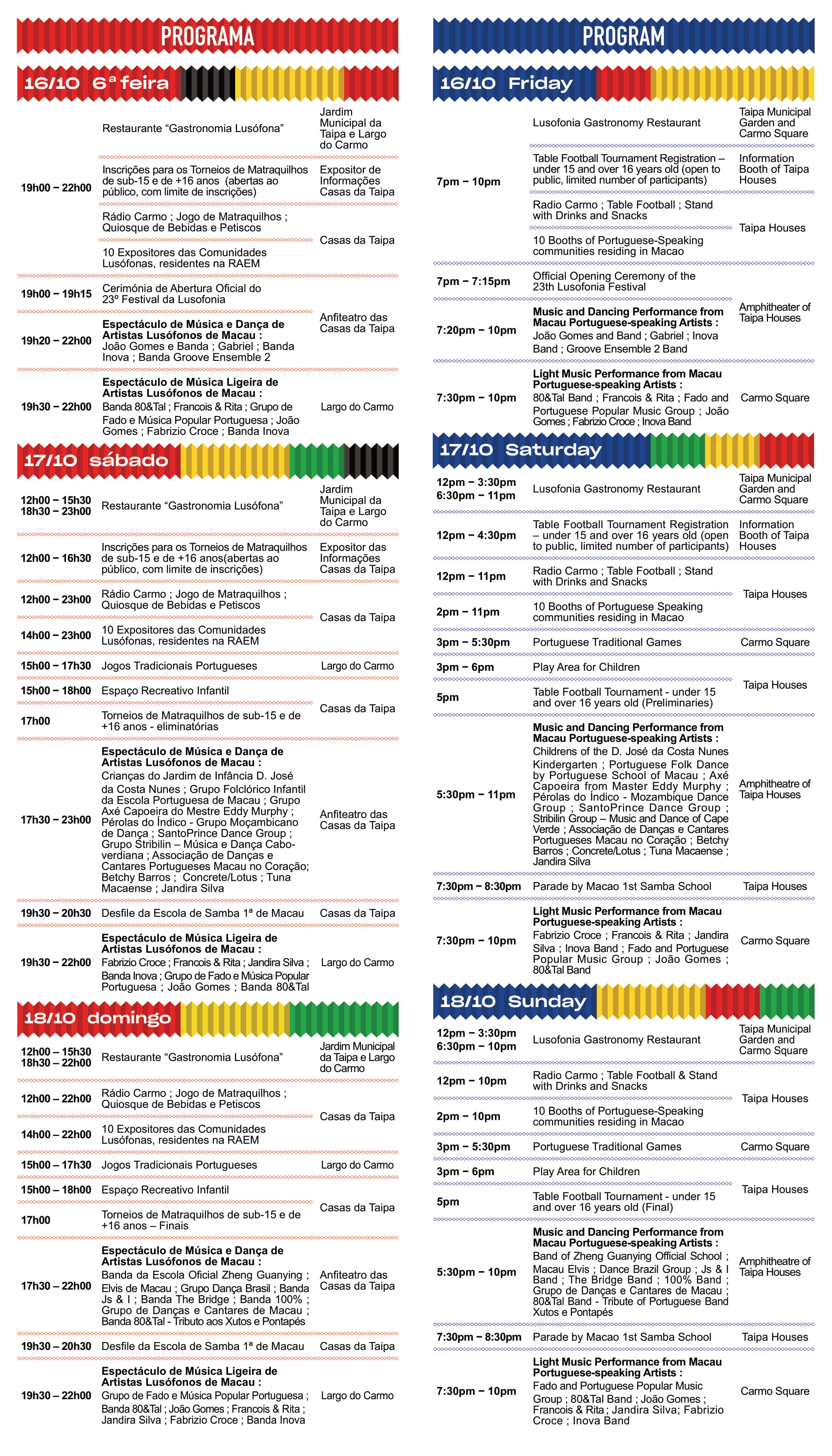 O programa desta edição é muito diversificado, tal como em edições anteriores. As 10 comunidades lusófonas residentes em Macau, nomeadamente de Angola, Brasil, Cabo Verde, Guiné Bissau, Goa, Damão e Diu, Moçambique, Portugal, São Tomé e Príncipe, Timor Leste e comunidade macaense irão instalar os seus expositores culturais no local para darem a conhecer a sua música, artes, imagens, artesanato, trajes tradicionais, literatura, informação turística, entre outros, e ainda os petiscos e bebidas típicas dos seus países ou regiões.