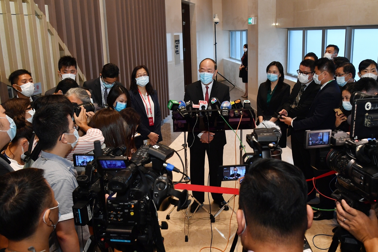 Sobre a eventual revisão da Lei relativa à defesa da segurança do Estado, o Chefe do Executivo disse que esta Lei, aprovada em 2009, há mais de 10 anos, não prevê de momento qualquer complemento ou a sua revisão e caso, no futuro, haja, o mesmo irá divulgar atempadamente ao público.