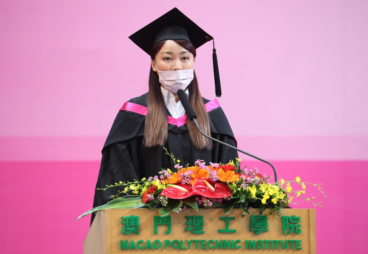 A aluna Ku Chong Ian, finalista do Curso de Licenciatura em Administração Pública, em representação dos alunos finalistas, apresentou os seus agradecimentos dirigidos, respectivamente: aos pais, pelo apoio, confiança e encorajamento; aos professores do IPM, pela atenção, educação e formação; ao Governo da RAEM, pela alta importância e atenção que tem dado aos estudantes do ensino superior ao longo dos anos. A aluna referiu ainda que, no período difícil da epidemia, a resposta imediata do IPM fez-lhes conseguir ultrapassar um estudo ocupado mas útil. E, assim, perante este ano final especial, ela e os colegas ultrapassaram todos os desafios e desenvolveram-se para continuar o caminho para o sucesso. Por fim, a aluna Ku afirmou que, no futuro, para além de assumirem a missão e responsabilidades sociais, eles, os graduados, continuarão a prosseguir corajosamente os sonhos, dando assim a sua contribuição para a sociedade e dignificando o IPM.