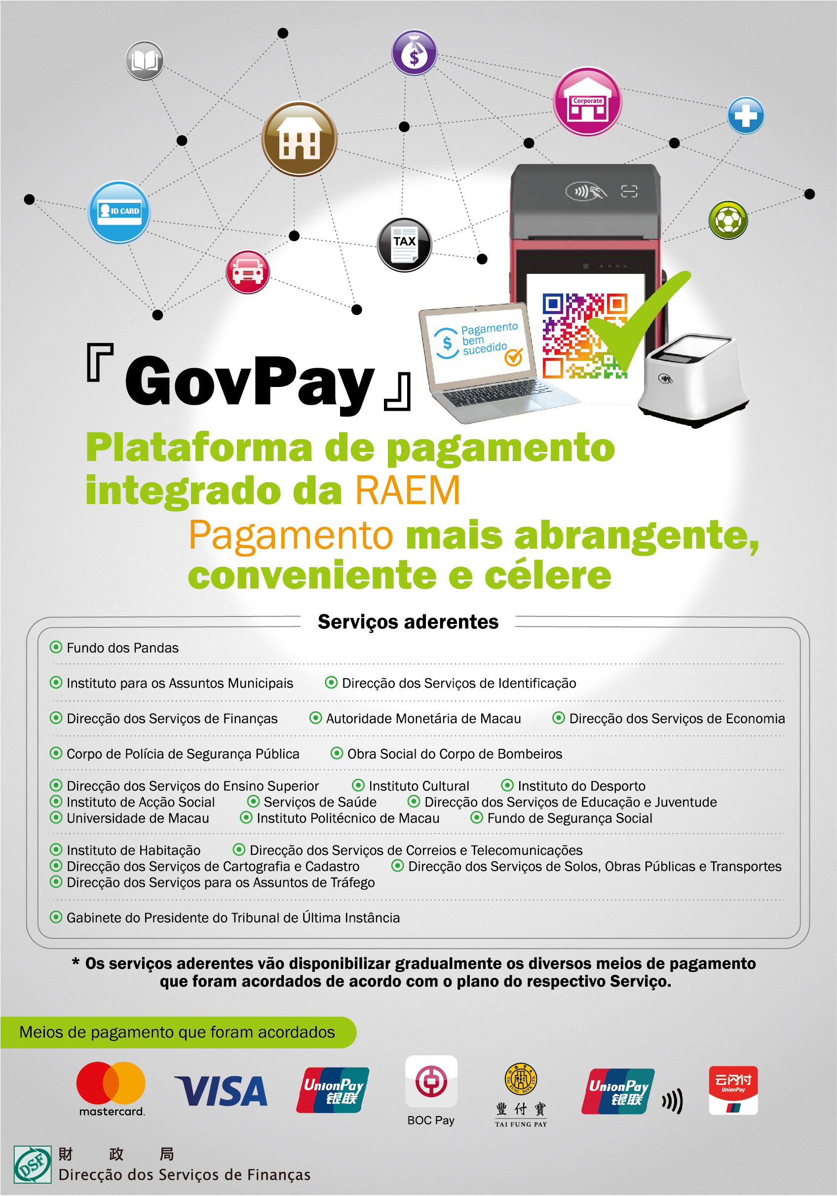 No intuito de facilitar o pagamento das diversas taxas fiscais do Governo por parte da população e promover a estratégia do desenvolvimento do pagamento electrónico do Governo da RAEM, a Direcção dos Serviços de Finanças lançou, no terceiro trimestre de 2019, a plataforma de pagamento integrado da Região Administrativa Especial de Macau “GovPay” que integra a aplicação online e offline.