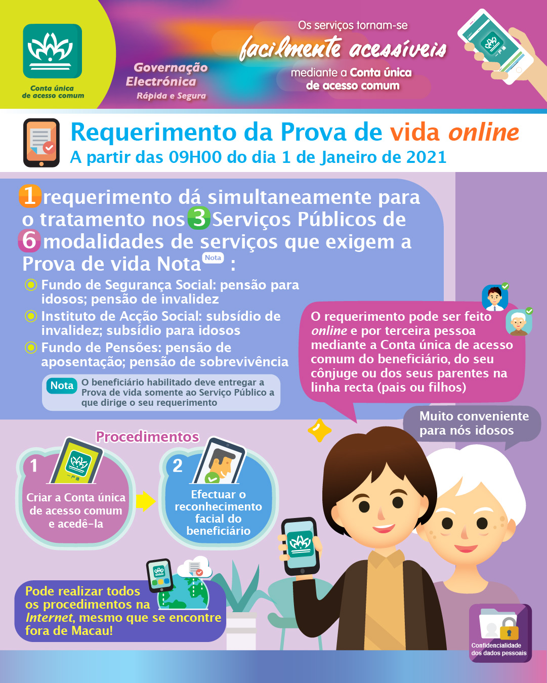 A partir das 09H00 do dia 1 de Janeiro de 2021, os cidadãos podem tratar da Prova de vida exigida pelo Fundo de Segurança Social (FSS), pelo Instituto de Acção Social (IAS) ou pelo Fundo de Pensões (FP), através de requerimento, somente uma vez, mediante “Conta única de acesso comum”, sem necessidade de se dirigirem aos balcões de atendimento, permitindo mesmo aos indivíduos fora de Macau ou com dificuldades motores a possibilidade de fazê-lo online. Simultaneamente, a Direcção dos Serviços de Administração e Função Pública (SAFP) lançará uma versão simples da aplicação para telemóvel “Conta única de acesso”. Com a simplificação da página, a ampliação das letras e a configuração personalizada das funções, o interface operacional simplificado será mais acessível e proporcionará aos utentes uma nova experiência.
