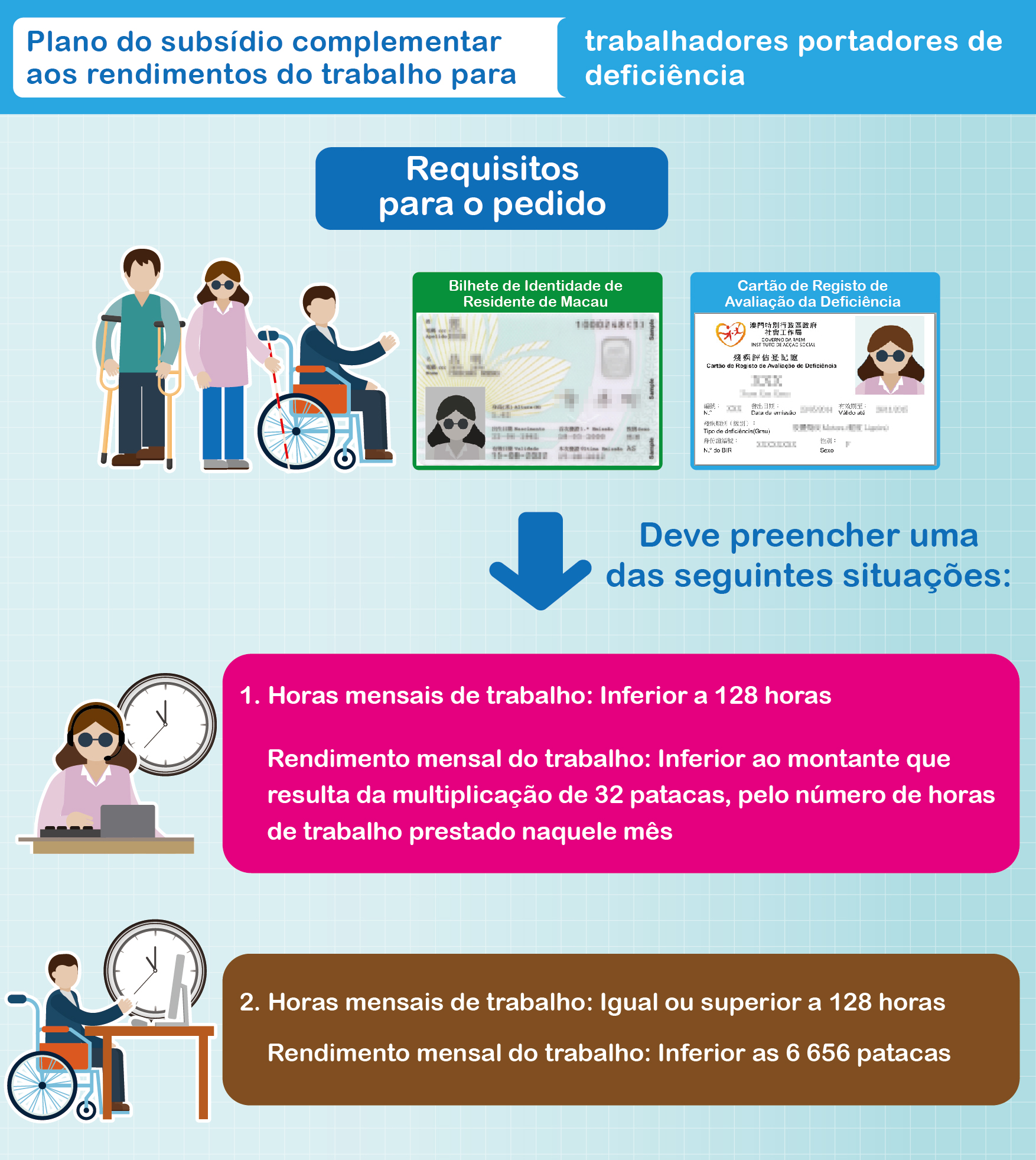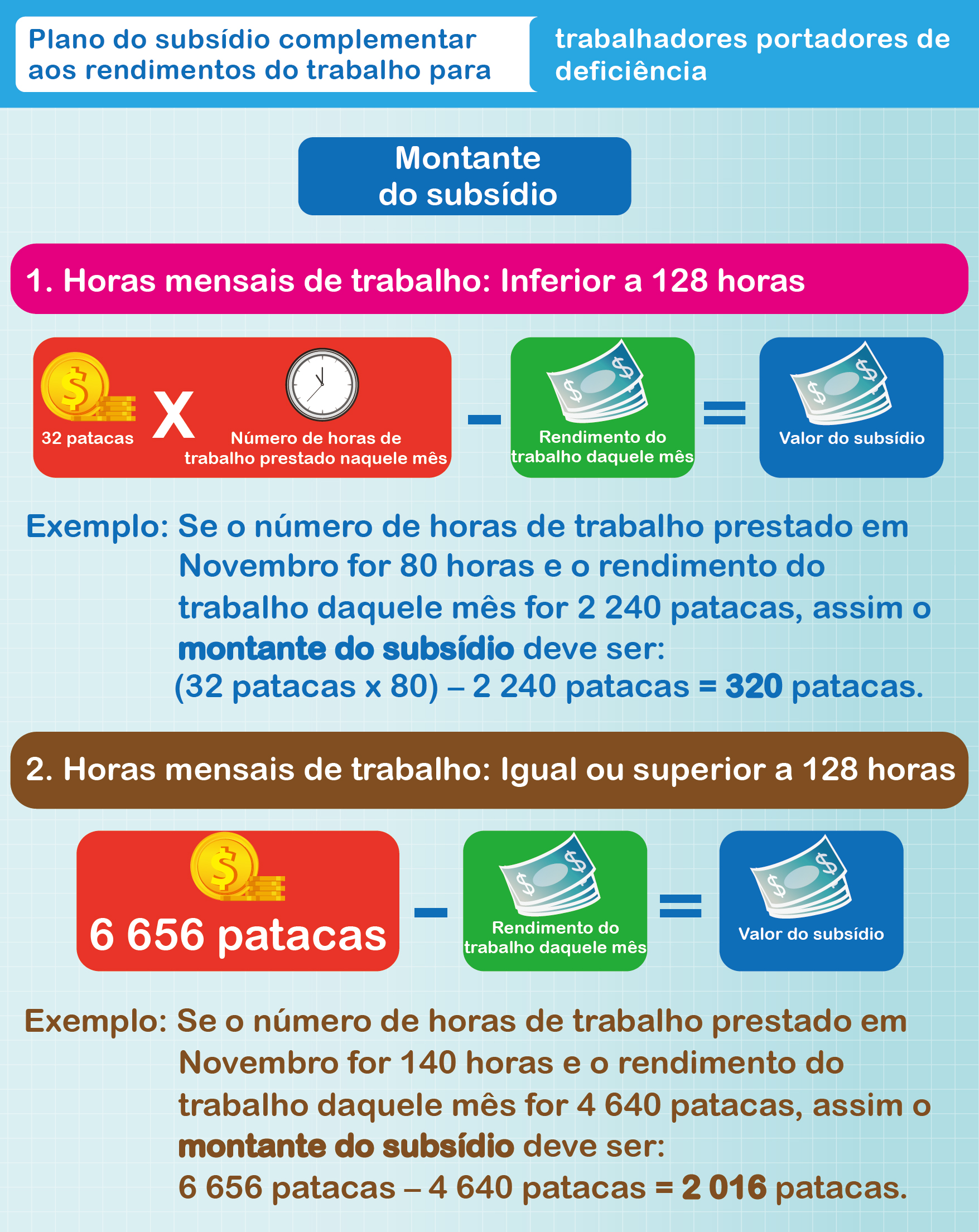 Para mais informações sobre o Plano do subsídio complementar aos rendimentos do trabalho para trabalhadores portadores de deficiência, queira consultar a página electrónica ( https://www.dsal.gov.mo/zh_tw/standard/disability_income_subsidy.html ), ou contacte esta Direcção de Serviços através do telefone sob número 28700277 ou 66329329.