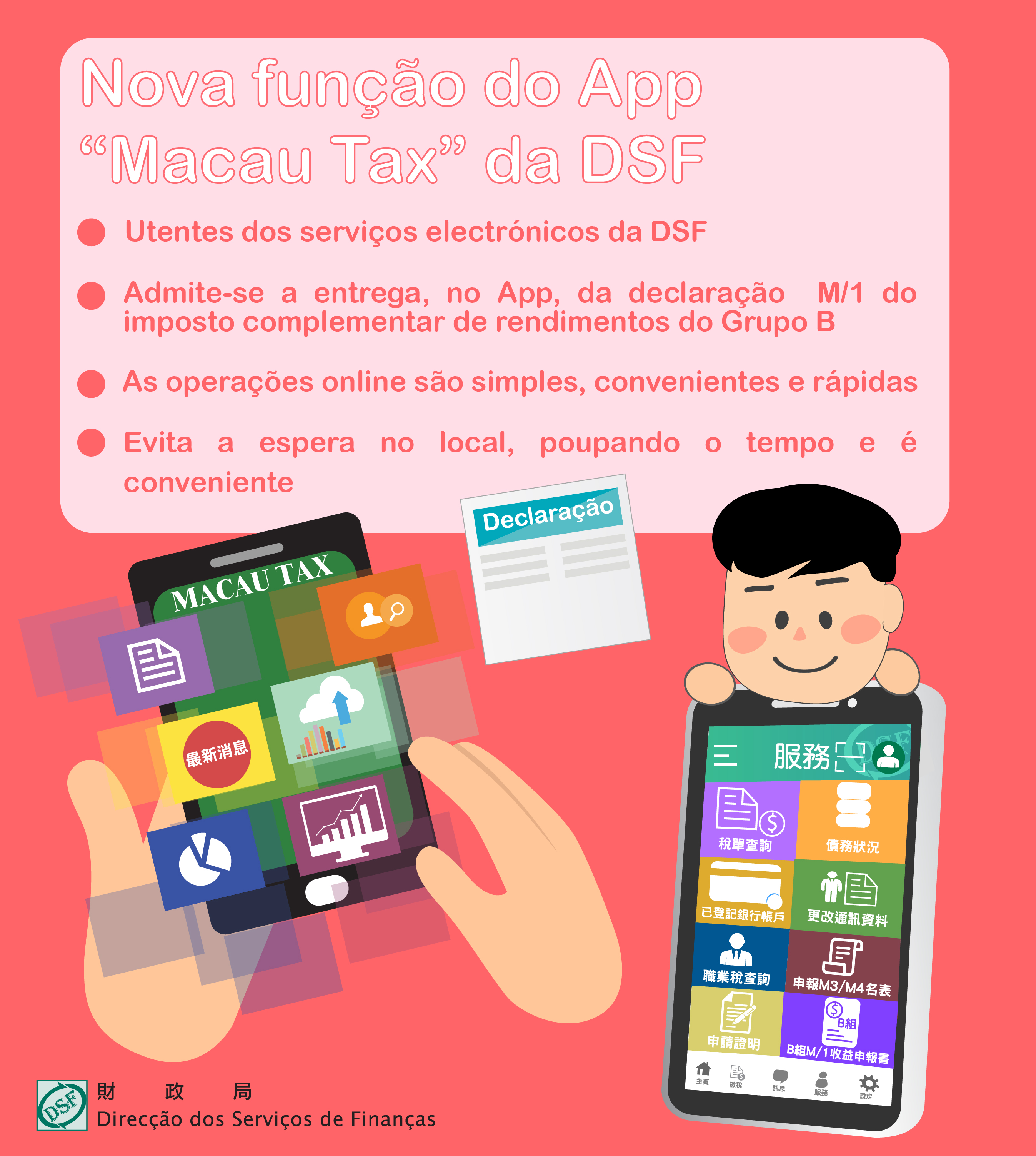 A fim de facilitar ainda mais os contribuintes das PME, a Direcção dos Serviços de Finanças (DSF) adicionou uma função na aplicação do telemóvel “Macau Tax”, agilizando a entrega por contribuintes da declaração M/1 do Imposto Complementar de Rendimentos do Grupo B.