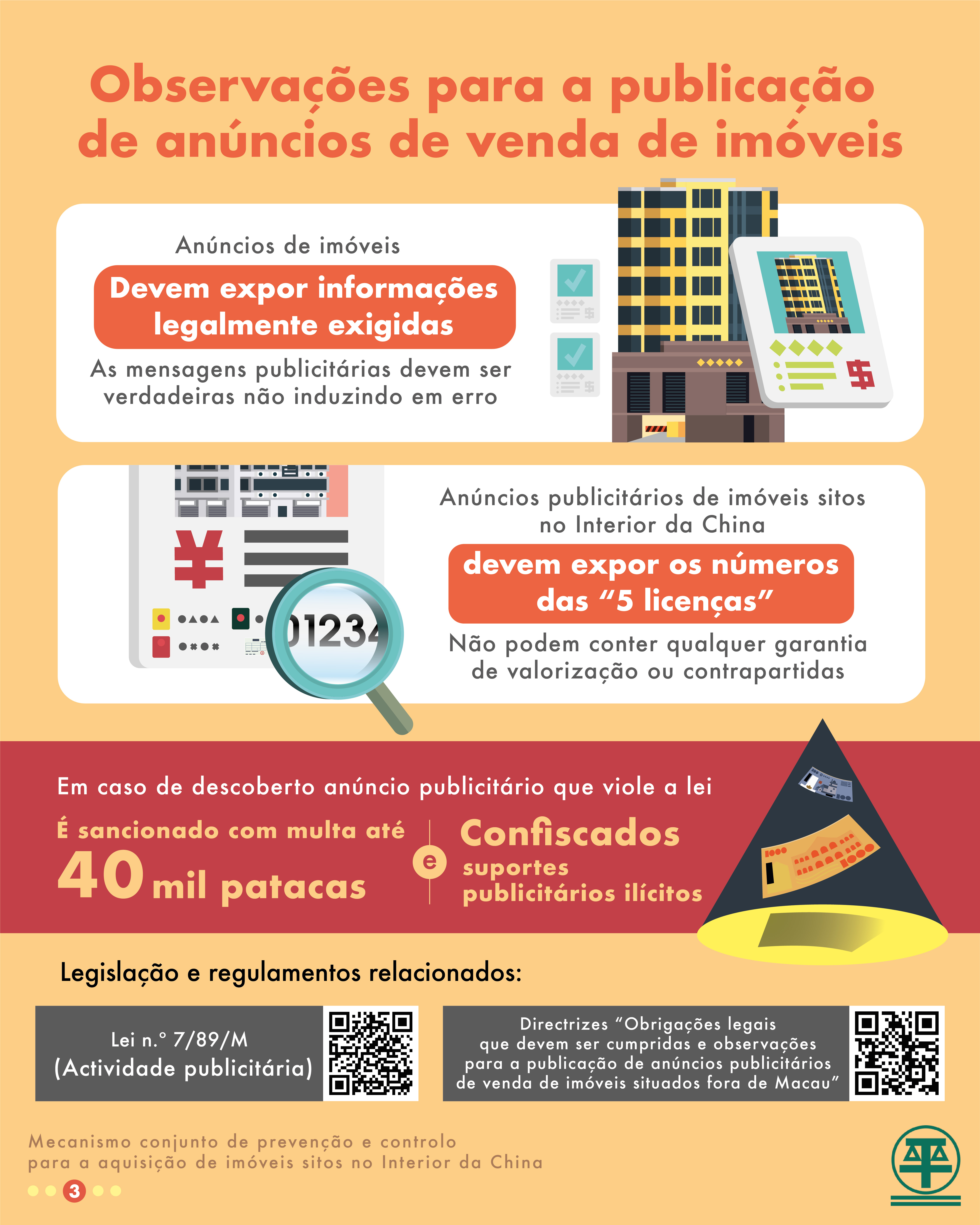 Tendo como objectivo o mecanismo conjunto de prevenção e controlo combater a divulgação de anúncios publicitários ilegais de edifícios, a DSEDT intensifica a fiscalização, quanto à publicação de anúncios publicitários de imóveis sitos no Interior da China, o cumprimento da legislação reguladora da actividade publicitária de Macau e das “Obrigações legais que devem ser cumpridas e observações para a publicação de anúncios publicitários de venda de imóveis situados fora de Macau”. Caso se verifique qualquer anúncio que viole a lei, a DSEDT irá aplicar multas aos infractores nos termos legais e confiscar o respectivo suporte publicitário ilícito, bem como a respectiva entidade municipal participante no mecanismo, logo que seja comunicada por parte de Macau a ilegalidade, irá proceder à investigação de anúncios publicitários ilegais. Além disso, exige-se que os operadores do sector cumpram rigorosamente as leis e os regulamentos do Interior da China e Macau. Tudo isso contribui para proteger conjuntamente, baseando-se no mecanismo de cooperação, os direitos e interesses dos residentes de Macau na aquisição de imóveis sitos no Interior da China.