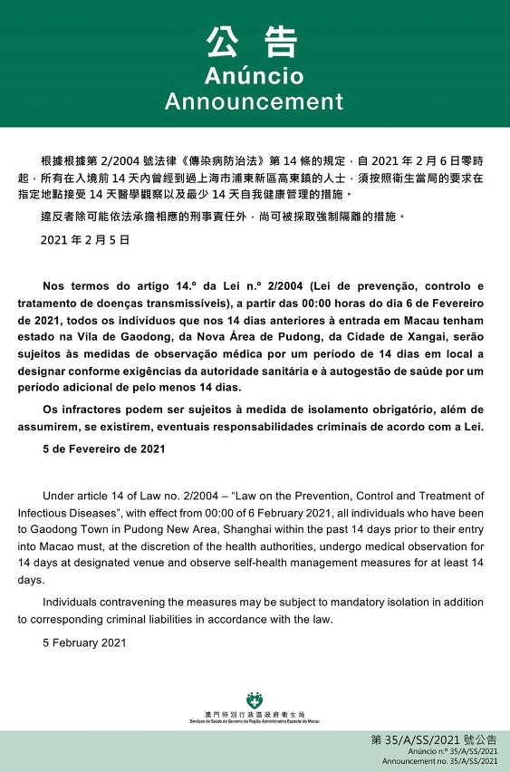 O Centro de Coordenação de Contingência do Novo Tipo de Coronavírus informa que tendo em consideração a evolução epidemiológica mais actualizada da Cidade de Xangai, nos termos do artigo 14.º da Lei n.º 2/2004 (Lei de prevenção, controlo e tratamento de doenças transmissíveis), a partir das 00:00 horas do dia 6 de Fevereiro de 2021, todos os indivíduos que nos 14 dias anteriores à entrada em Macau tenham estado na Vila de Gaodong, da Nova Área de Pudong, da Cidade de Xangai, serão sujeitos às medidas de observação médica por um período de 14 dias em local a designar conforme exigências da autoridade sanitária e à autogestão de saúde por um período adicional de pelo menos 14 dias.