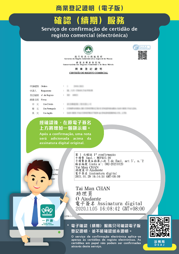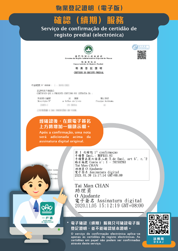 Para facilitar ainda mais o quotidiano da população, a DSAJ lança o serviço de confirmação electrónica de certidões de registo predial e comercial (electrónicas). Os residentes podem aceder ao sítio da Internet da DSAJ (https://www.dsaj.gov.mo) ou à aplicação para telemóvel da “Conta única de acesso comum” e efectuar o pedido de confirmação electrónica das certidões de registo, quando as informações constantes da certidão disponibilizada se mantenham inalteradas.