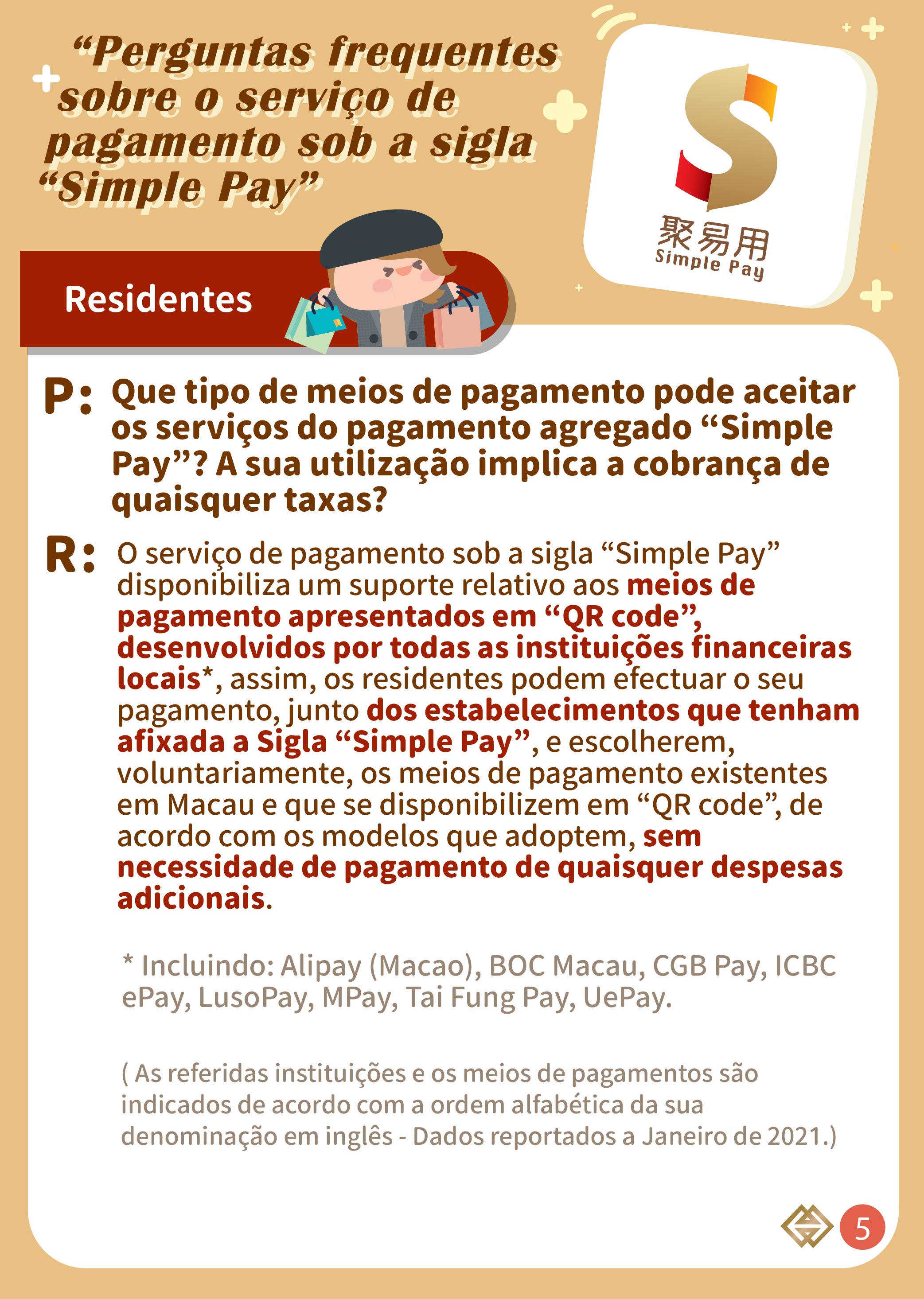 Para mais esclarecimentos, queiram por favor contactar directamente os respectivos bancos e instituições de pagamento, ou contactar a AMCM através do telefone n.º 2856 8856, podendo ser consultadas as informações detalhadas na página electrónica temática do “Simple Pay” (https://www.amcm.gov.mo/pt/news-and-announcements/simplepay).
