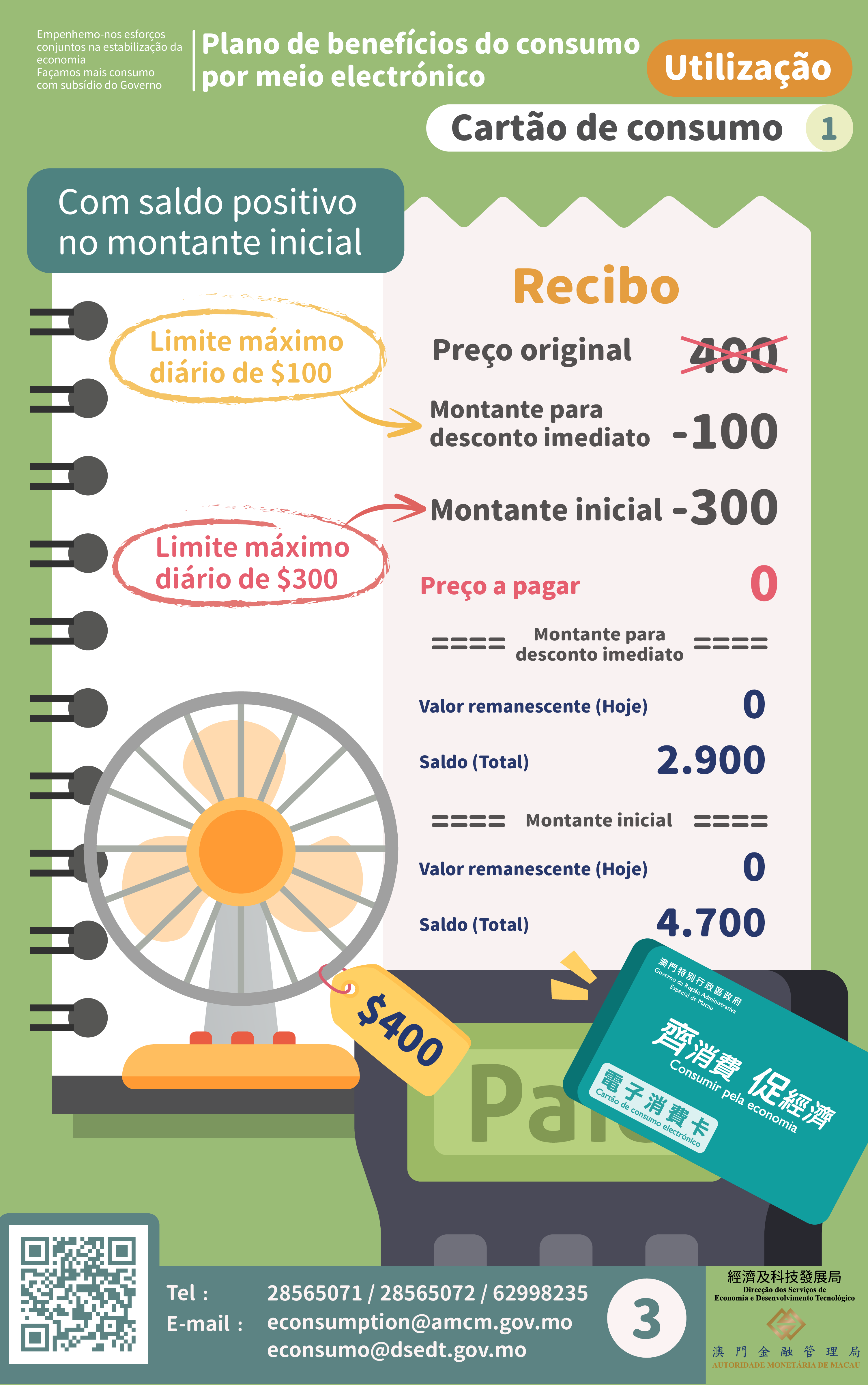 Os “benefícios de consumo por meio electrónico” dividem-se em duas partes: “montante inicial”, no valor de 5 000 patacas; e, “desconto imediato”, no valor de 3 000 patacas. Ambos devem ser utilizados conjuntamente. E ao consumir, 25% do valor da transacção (ou seja desconto de 25%) será deduzido no montante do “desconto imediato”, e o restante 75% será deduzido no “montante inicial”.