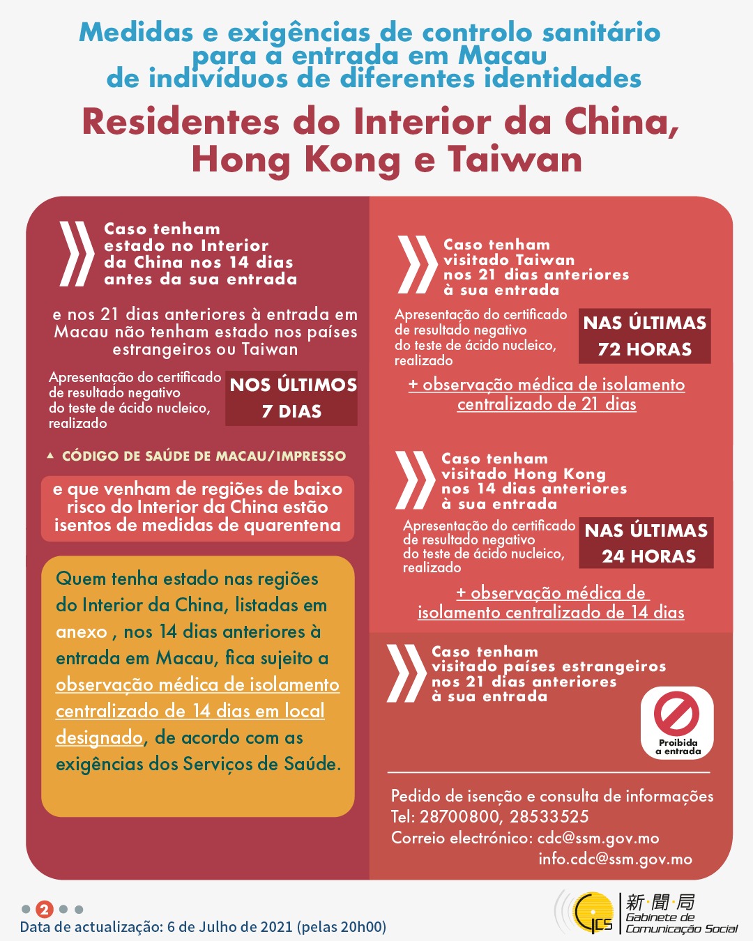 Medidas e exigências de controlo sanitário para a entrada em Macau de indivíduos de diferentes identidades.