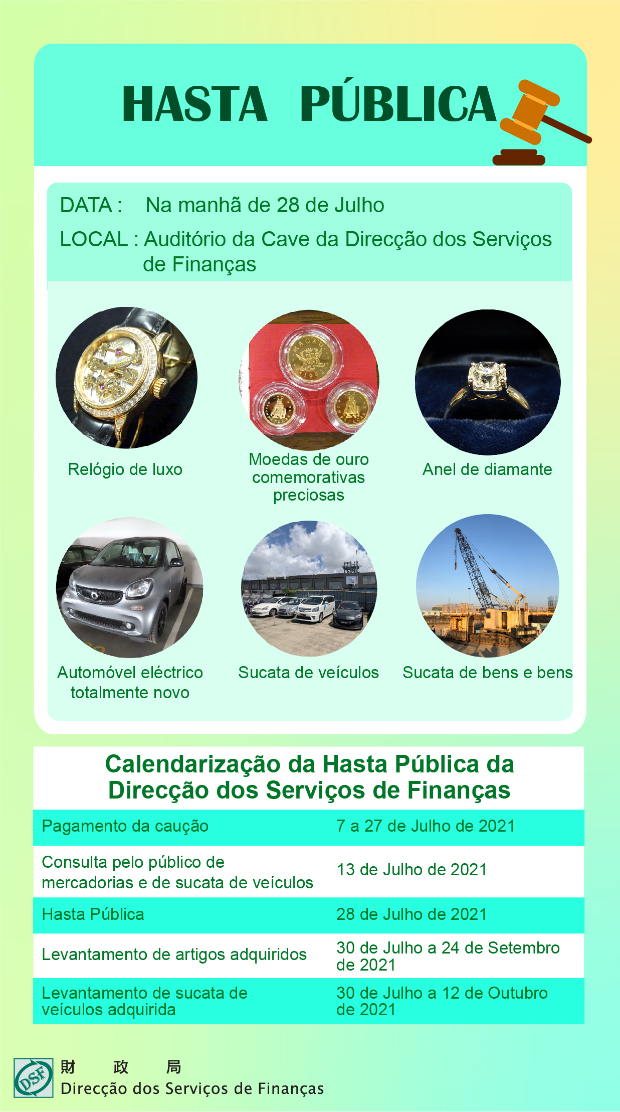 A Direcção dos Serviços de Finanças (DSF) vai realizar, em 28 de Julho, às 10 horas da manhã, no auditório, sito na cave da DSF, a hasta pública de todos os artigos revertidos a favor da RAEM, incluindo relógios de luxo, anéis de diamante, moedas de ouro comemorativas preciosas e automóveis eléctricos totalmente novos, etc., contando ainda com algumas sucatas resultantes de veículos, de sucata de bens e de bens, que foram abatidos mas que são propriedade da RAEM.