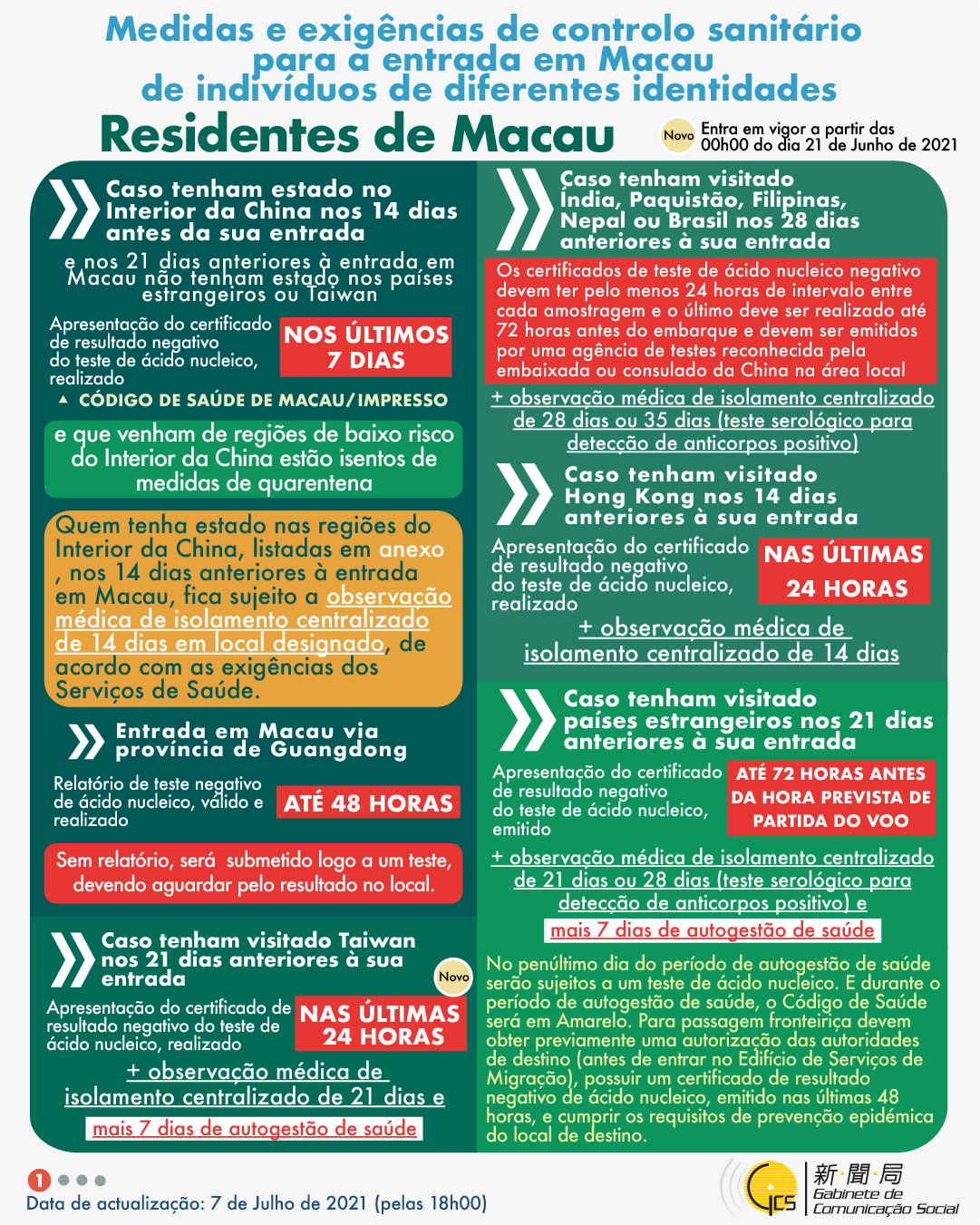 (Infografia)Medidas e exigências de controlo sanitário para a entrada em Macau de indivíduos de diferentes identidades, actualizadas no dia 7 de Julho de 2021