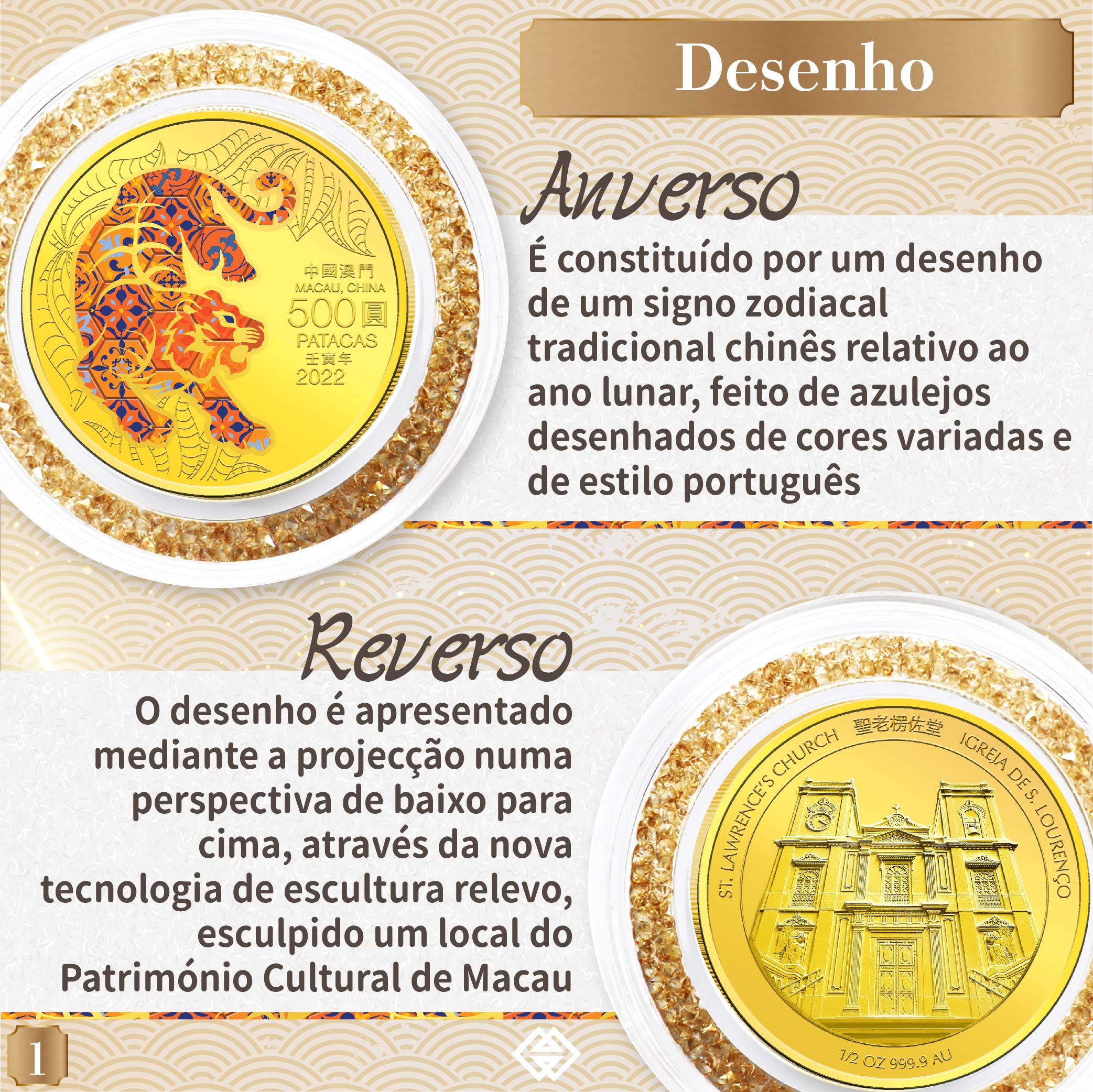 O anverso da moeda comemorativa do Ano Novo Lunar do Tigre é constituído por um desenho de um signo zodiacal tradicional chinês relativo ao ano lunar, feito de azulejos desenhados de cores variadas e de estilo português, enquanto que no reverso da moeda comemorativa, o desenho é apresentado mediante a projecção numa perspectiva de baixo para cima, através da nova tecnologia de escultura relevo, esculpido um local do Património Cultural de Macau. Ora, as moedas comemorativas do Ano Lunar do Tigre são constituídas por uma moeda de prata “proof” com 1 onça, uma moeda de prata “proof” com 5 onças e uma moeda de ouro “proof” com 0,5 onça. Os preços dos três tipos de moedas comemorativas são 1.230 patacas, 7.200 patacas e 15.000 patacas, respectivamente.