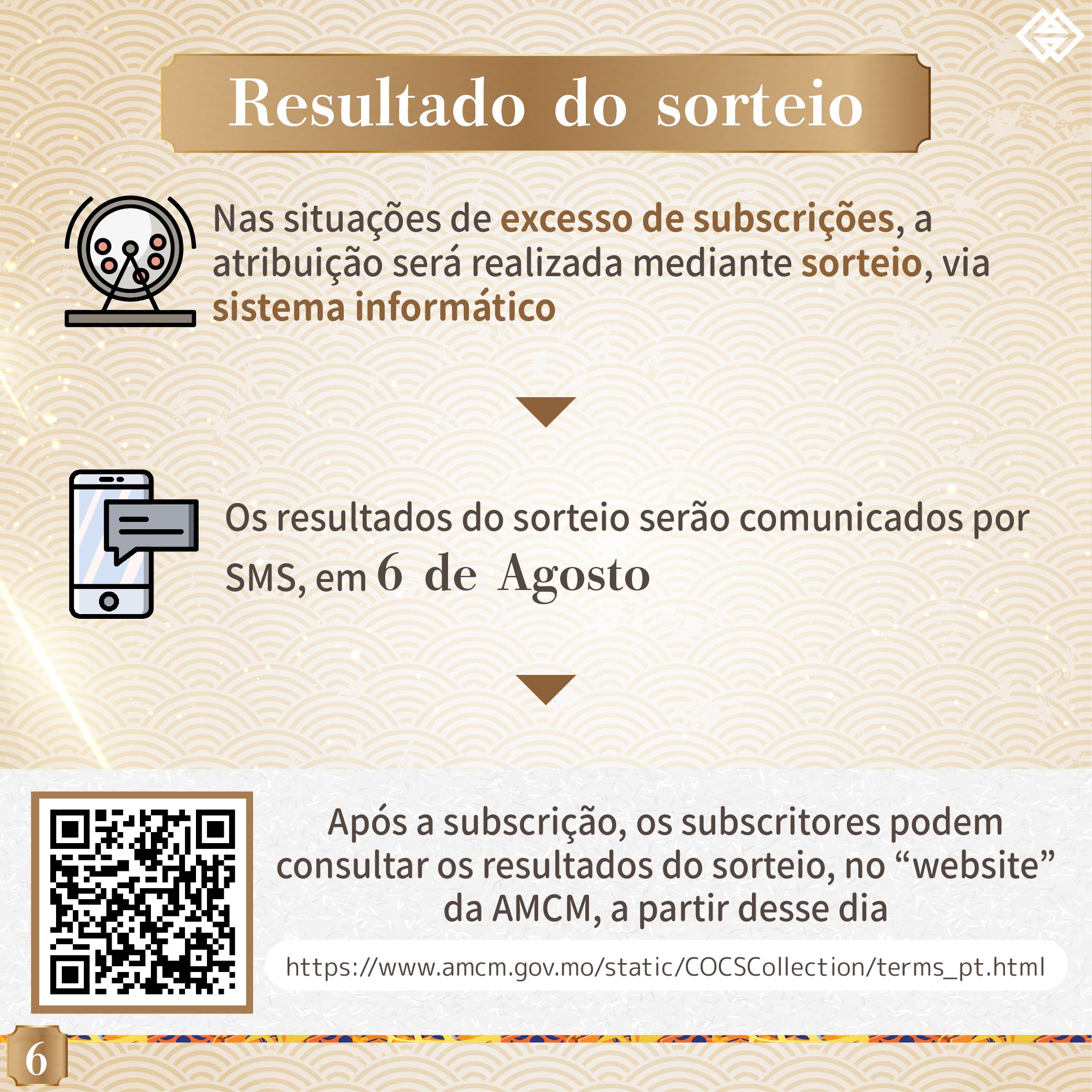 Cada residente de Macau pode apenas apresentar uma subscrição, subscrevendo cada uma das três moedas comemorativas atrás referidas. Nas situações de excesso de subscrições, a atribuição será realizada mediante sorteio, via sistema informático. Os resultados do sorteio serão comunicados por SMS, em 6 de Agosto de 2021. Após a subscrição, os subscritores podem consultar os resultados do sorteio, no “website” da AMCM, a partir desse dia.