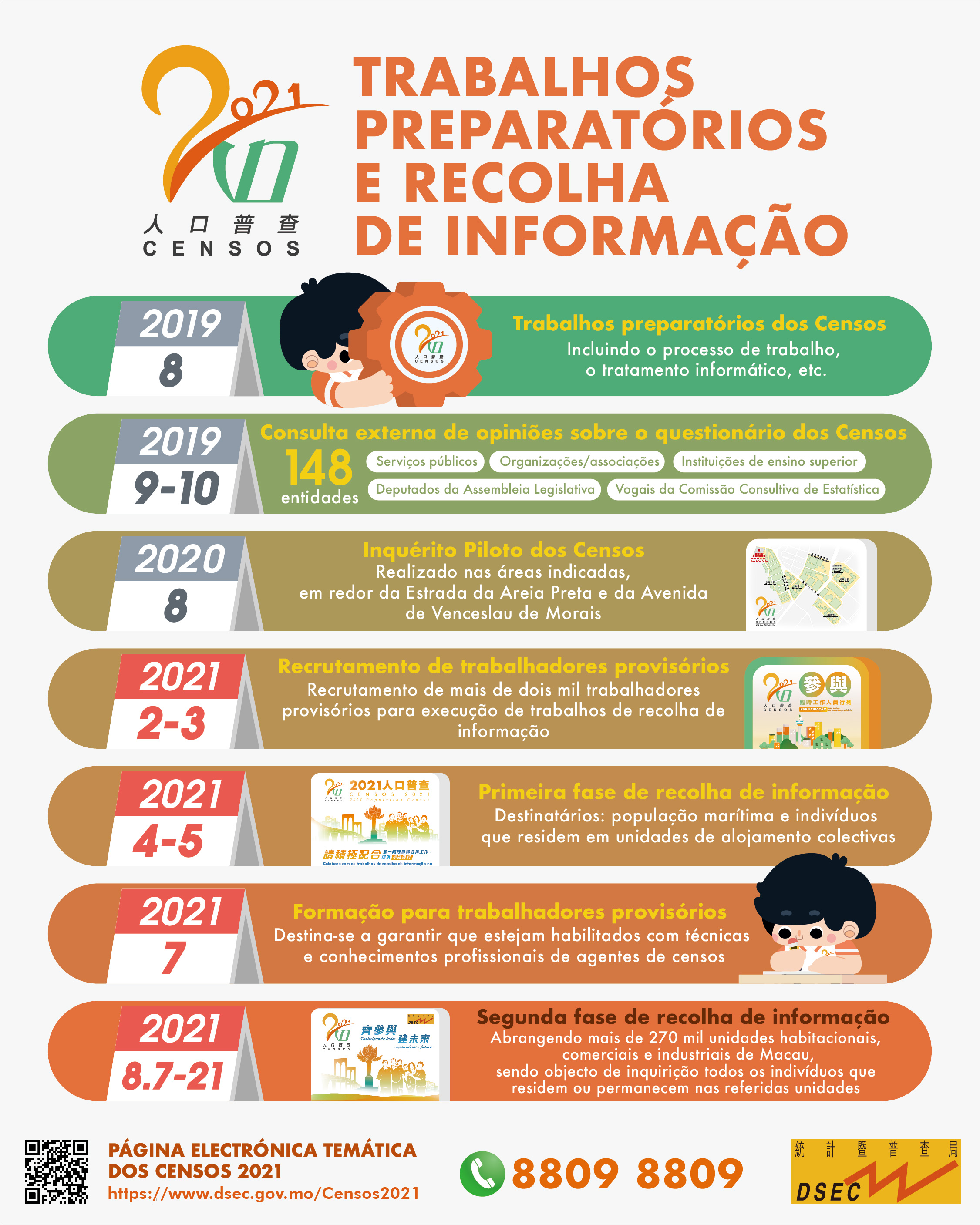 Para assegurar a boa execução dos Censos decenais, a operação estatística de maior dimensão em Macau, a Direcção dos Serviços de Estatística e Censos (DSEC) deu início há dois anos, de forma faseada, aos trabalhos preparatórios, incluindo a concepção do questionário censitário e a realização do Inquérito Piloto em zonas específicas. Tendo sido concluída em Maio do corrente ano a primeira fase do trabalho de recolha de informação, a segunda fase dos Censos decorrerá em Agosto, recolhendo informação junto de mais de 270 mil unidades habitacionais, comerciais e industriais de Macau.