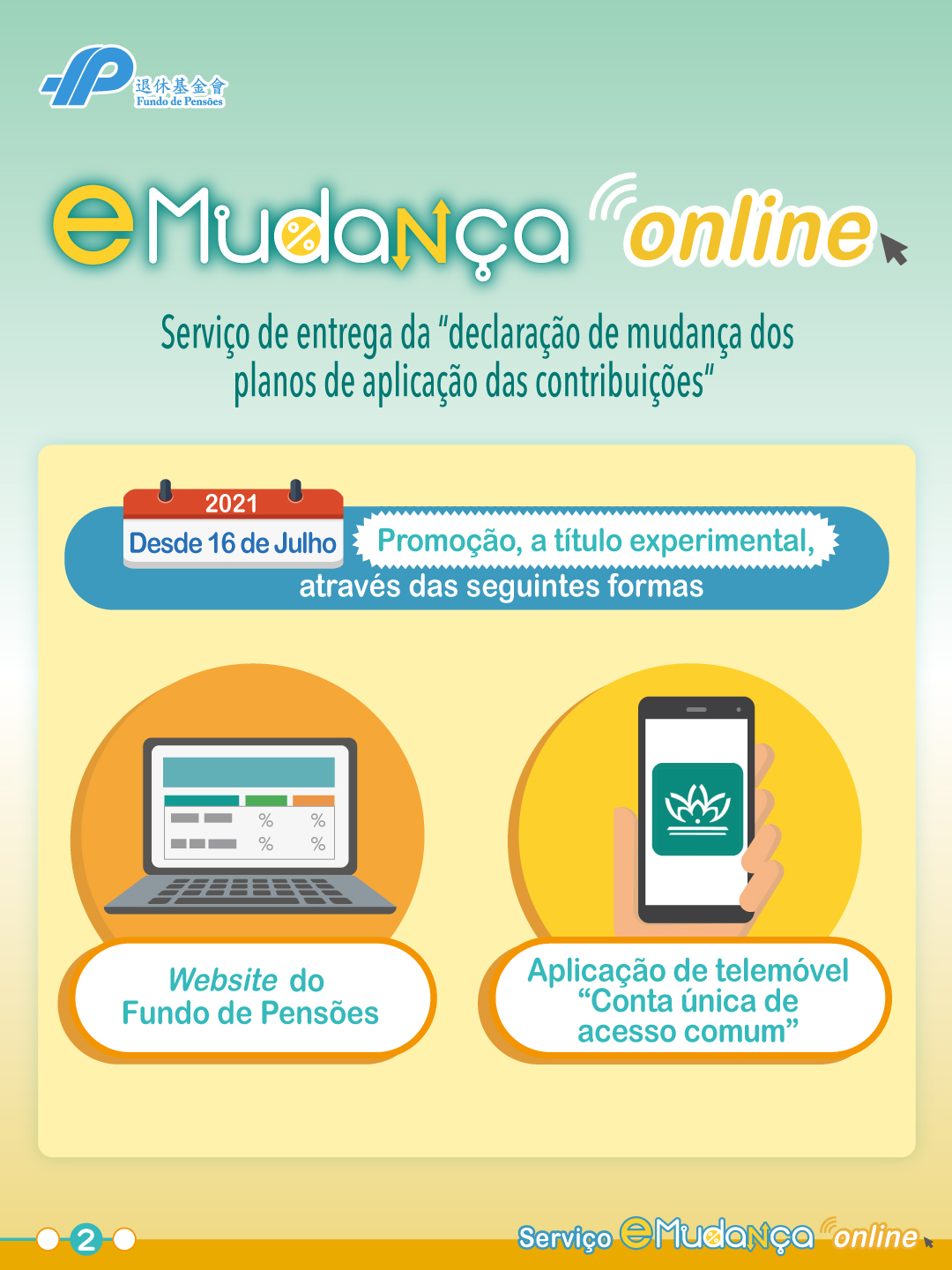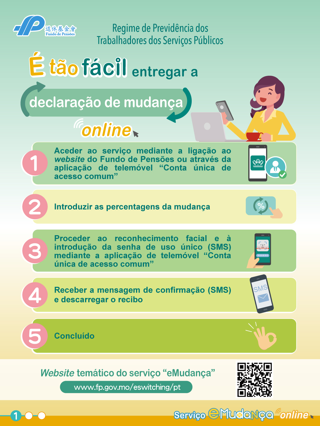 Os contribuintes podem, no prazo fixado para a mudança, aceder ao serviço “eMudança” através do website do Fundo de Pensões (www.fp.gov.mo) ou da aplicação de telemóvel “Conta única de acesso comum”, e mediante o login na “Conta única de acesso comum” e a verificação através do “Reconhecimento facial e Senha de uso único (SMS)”, proceder à entrega da declaração de mudança. Após a conclusão da entrega, irão receber a mensagem de confirmação (SMS), e em simultâneo, podem descarregar o recibo que contém os registos detalhados da mudança, sendo a operação simples, rápida e conveniente.