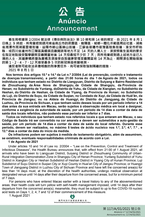 O Centro de Coordenação de Contingência do Novo Tipo de Coronavírus informa que tendo em consideração a evolução epidemiológica mais actualizada da Província de Henan, Hunan, Jiangsu e Sichuan, nos termos dos artigos 10.º e 14.º da Lei n.º 2/2004 (Lei de prevenção, controlo e tratamento de doenças transmissíveis), a partir das 21:00 do dia 1 de Agosto de 2021, todos os indivíduos que tenham estado no Distrito de Liangyuan, Distrito de Suiyang e Bairro Residencial de Zhouzhuang da Área Nova de Shangqiu, da Cidade de Shangqiu, da Província de Henan; no Subdistrito de Yuntang, do Distrito de Yuhu, da Cidade de Xiangtan, no Subdistrito de Heshan, do Distrito de Heshan, da Cidade de Yiyang, da Província de Hunan; no Subdistrito de Luji, do Distrito de Suyu, da Cidade de Suqian, no Condado de Xuyi, da Cidade de Huái'ān, da Província de Jiangsu; ou na Aldeia de Huangyi, do Distrito de Jiangyang, da Cidade de Luzhou, da Província de Sichuan, e que tenham saído desses locais por um período inferior a 14 dias antes da sua entrada em Macau, serão sujeitos à observação médica em local a designar, conforme a exigência da autoridade de saúde, por um período de 14 dias a contar da data de saída dos locais referidos, não podendo esse período ser inferior a 7 dias.