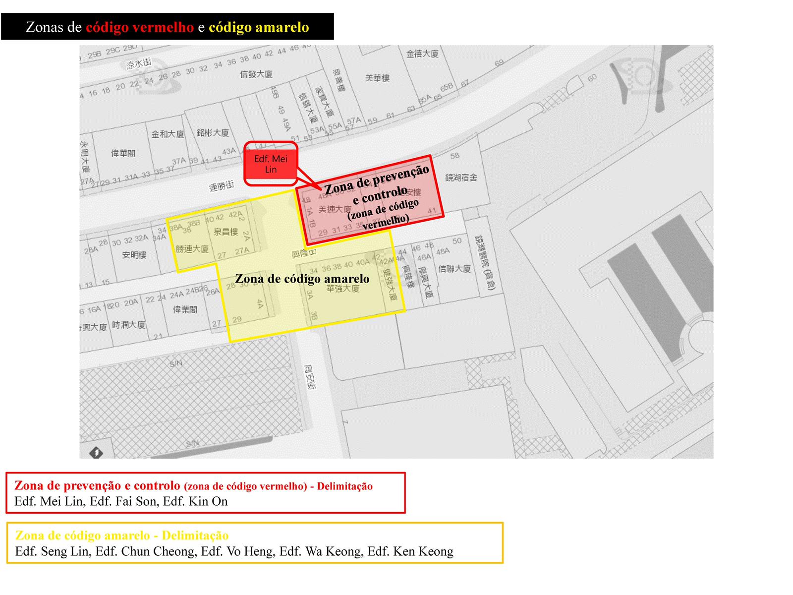Além disso, foram adoptadas medidas idênticas nos cinco edifícios (Edifício Seng Lin, Edifício Chun Cheong, Edifício Vo Heng, Edifício Wa Keong e Edifício Ken Keong) que se situam perto dos três edifícios da zona de prevenção e controlo, nomeadamente, com gestão e controlo do Código de Saúde de cor amarela, ou seja, o Código de Saúde dos indivíduos no local passa a ser amarelo pelo que devem ser submetidos a testes de ácido nucleico no local designado (Hospital Kiang Wu). O primeiro teste de ácido nucleico deve ser concluído dentro de 24 horas e poderá ser exigida a realização de mais testes. As outras medidas de controlo incluem a imposição de restrições à saída de Macau e uma supervisão rigorosa de saúde e autogestão de saúde por um período de, pelo menos, 14 dias.