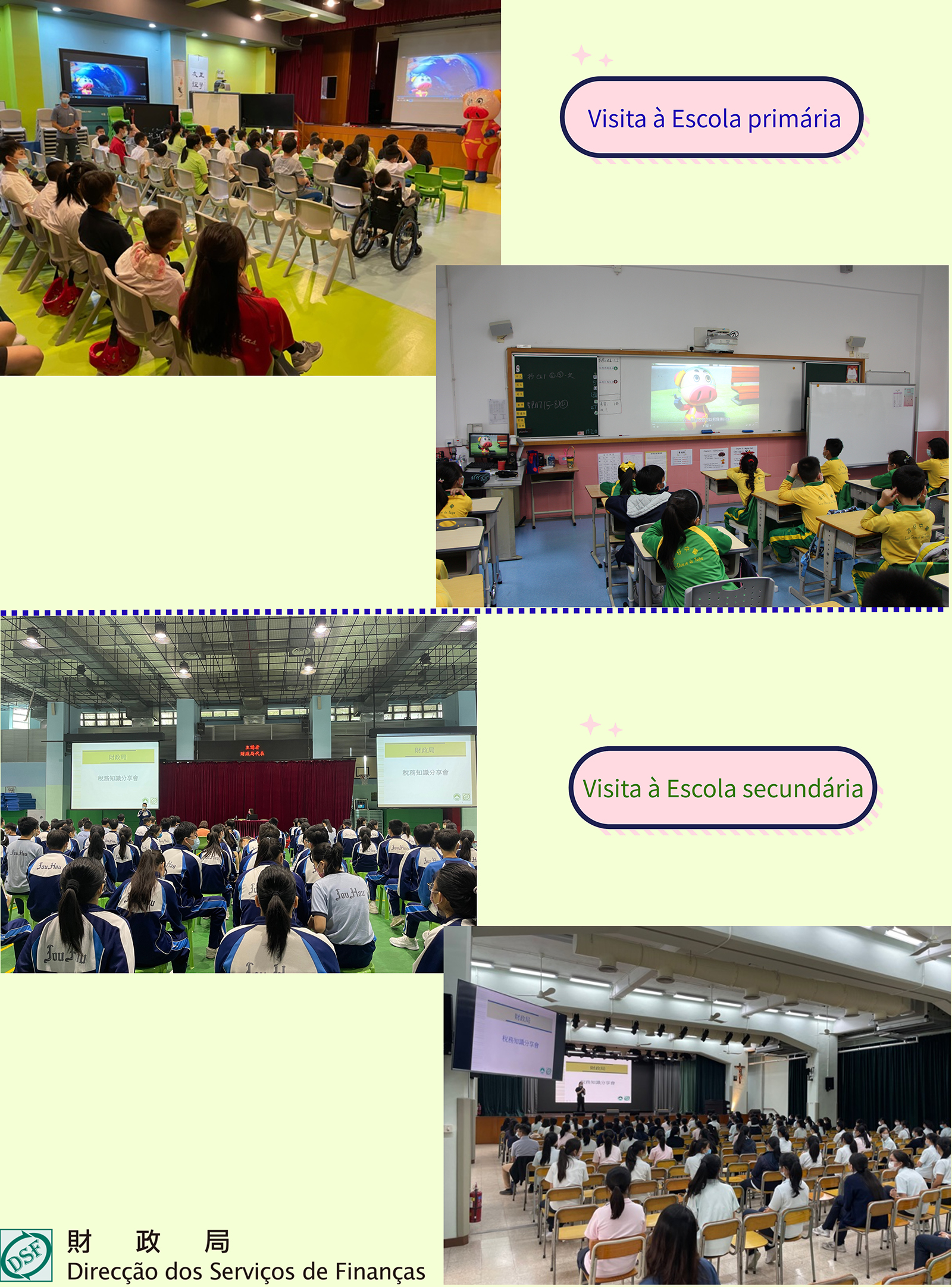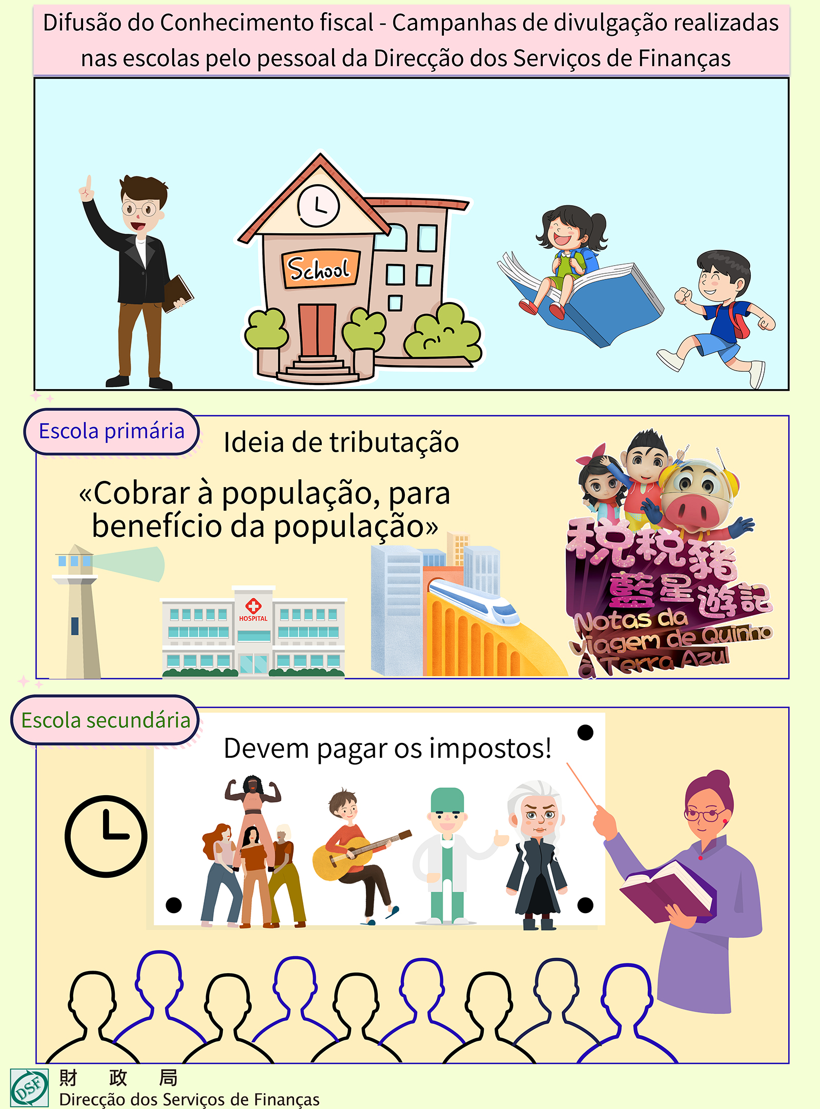 Desde Março do ano corrente, o pessoal da DSF visitou várias escolas, sendo as escolas primárias visitadas: a Escola Luso-Chinesa da Taipa, a Escola Keang Peng, a Escola Dom João Paulino, a Escola Kao Yip, a Escola Caritas de Macau e a Escola Chong Tak. Aos alunos do ensino primário, começa-se por transmitir o filme de animação “Notas de Viagem do Quinho à Terra Azul”, por via desta narrativa, pretende-se ensinar duma forma divertida e orientar os alunos para que compreendam a ideia de tributação que é “cobrar à população, para benefício da população”, permitindo-lhes perceber claramente que declarar e pagar impostos é um dever cívico de todos os cidadãos de Macau.