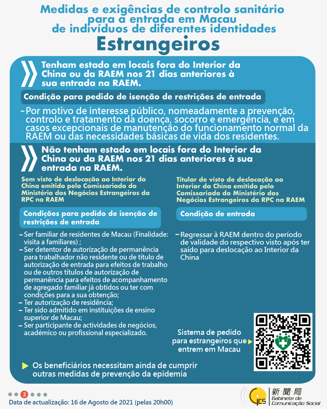 (Infografia)Medidas e exigências de controlo sanitário para a entrada em Macau de indivíduos de diferentes identidades, actualizadas no dia 16 de Agosto de 2021