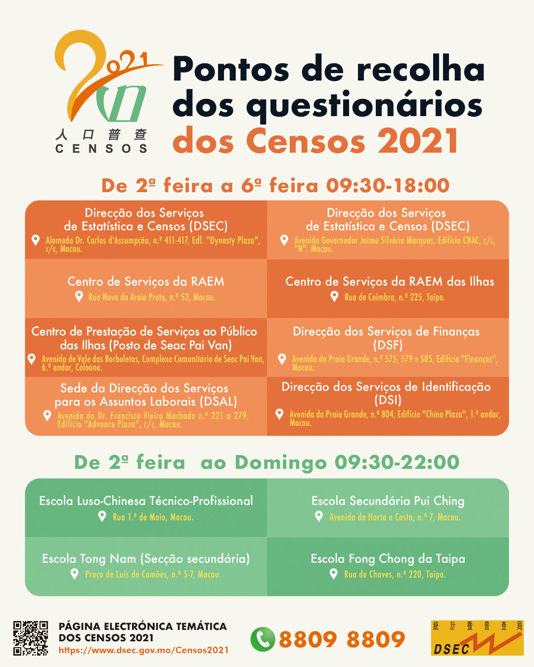 Para mais pormenores sobre os Censos, queira aceder à página electrónica temática dos Censos 2021: https://www.dsec.gov.mo/Censos2021, ou ligar para a linha azul dos Censos 8809 8809.