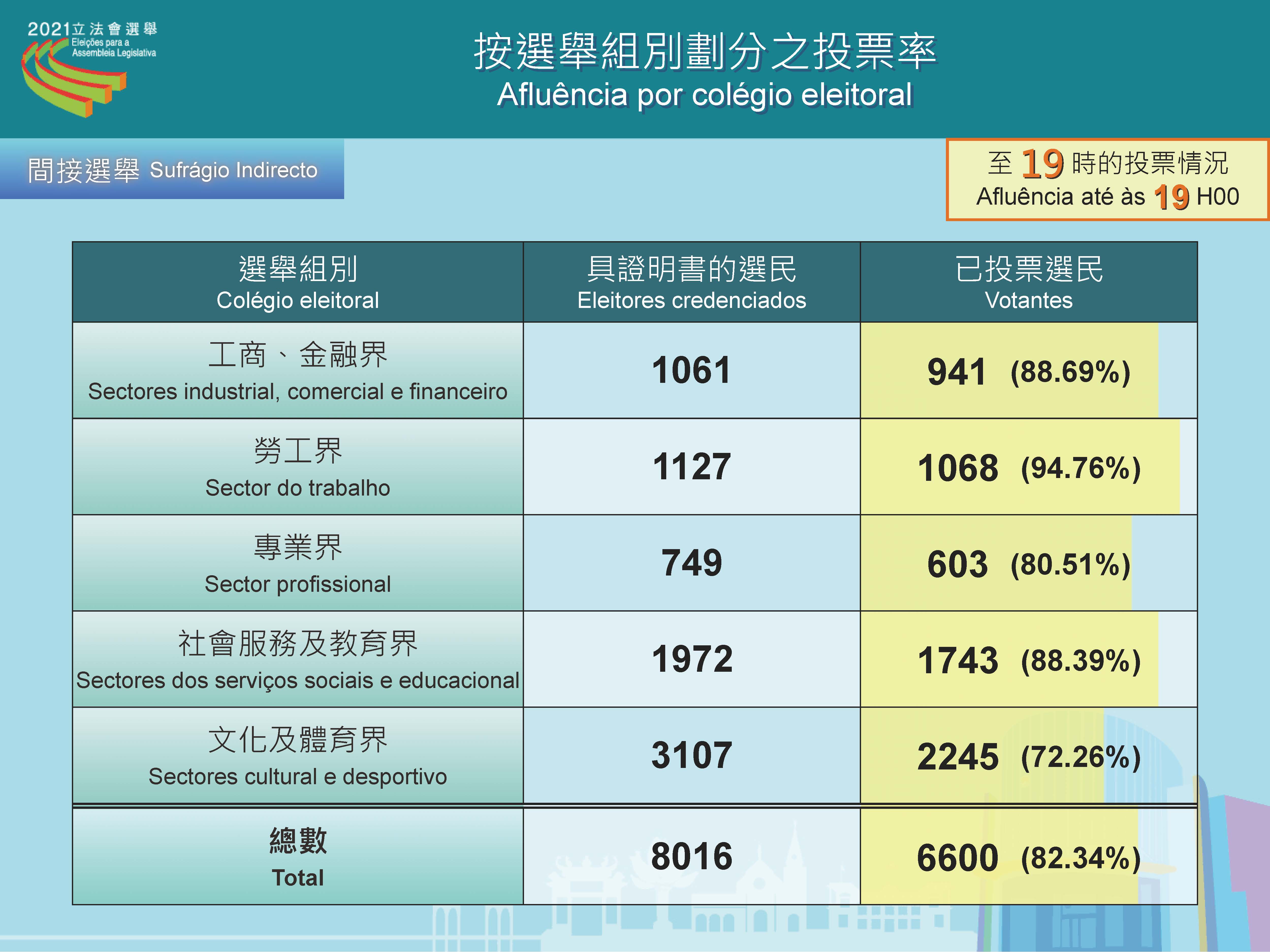Até às 19h00, desde abertura das assembleias de voto, a taxa de afluência às urnas do sufrágio directo foi de 37,88 por cento, num total de 122 692 pessoas, que votaram nas Eleições da Assembleia Legislativa, 12 de Setembro. No sufrágio indirecto votaram 6 600 pessoas, representando uma taxa de afluência de 82,34 por cento.