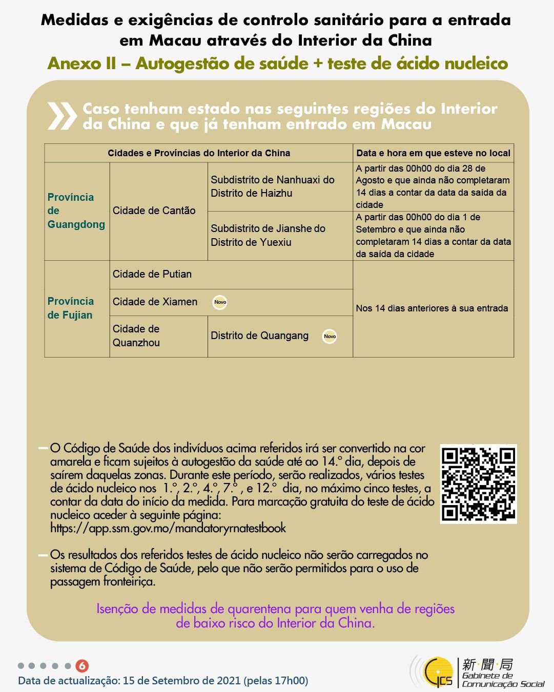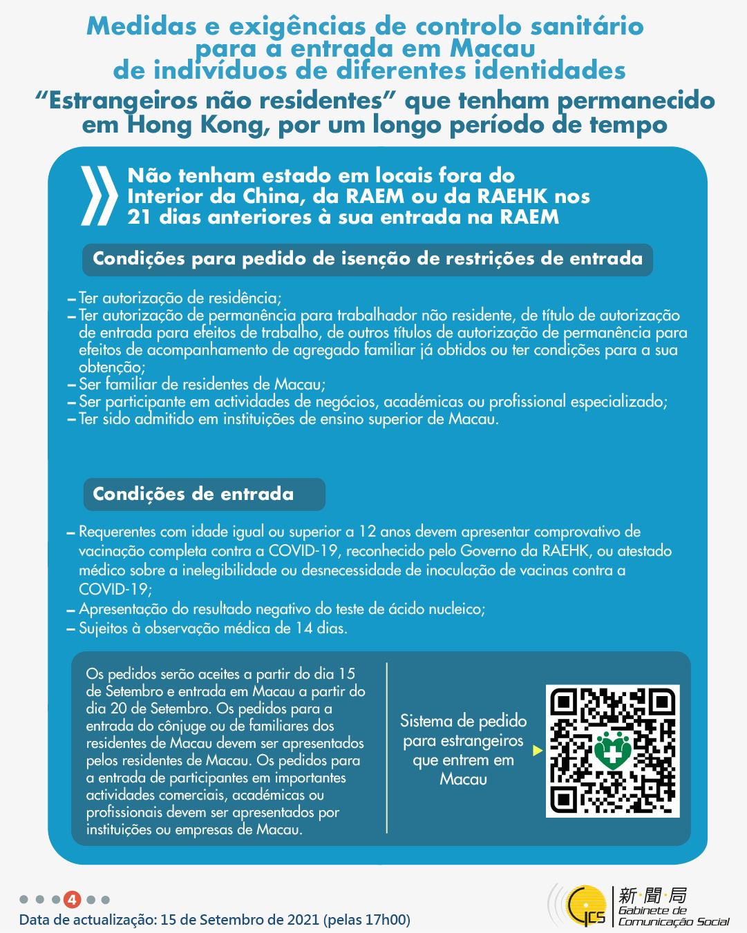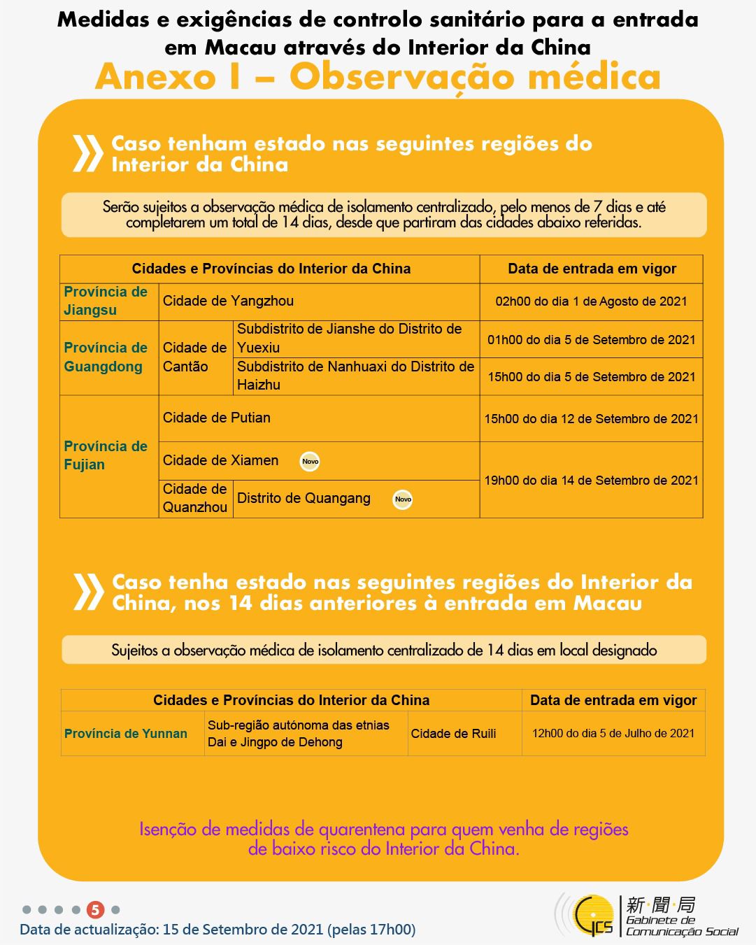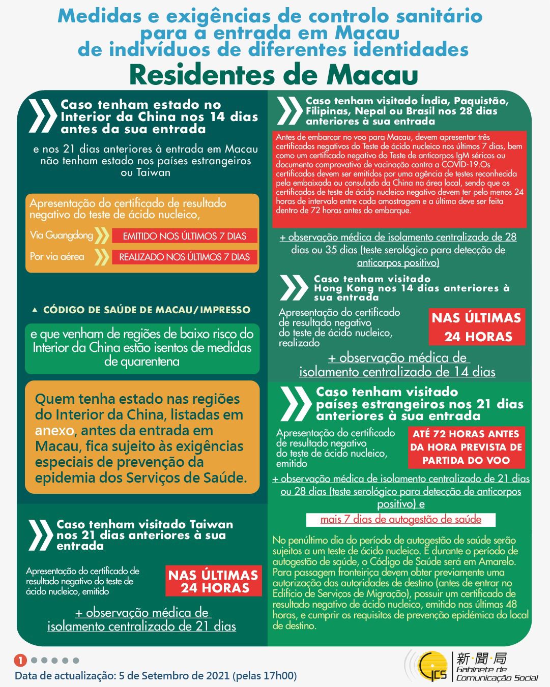 (Infografia)Medidas e exigências de controlo sanitário para a entrada em Macau de indivíduos de diferentes identidades, actualizadas no dia 15 de Setembro de 2021