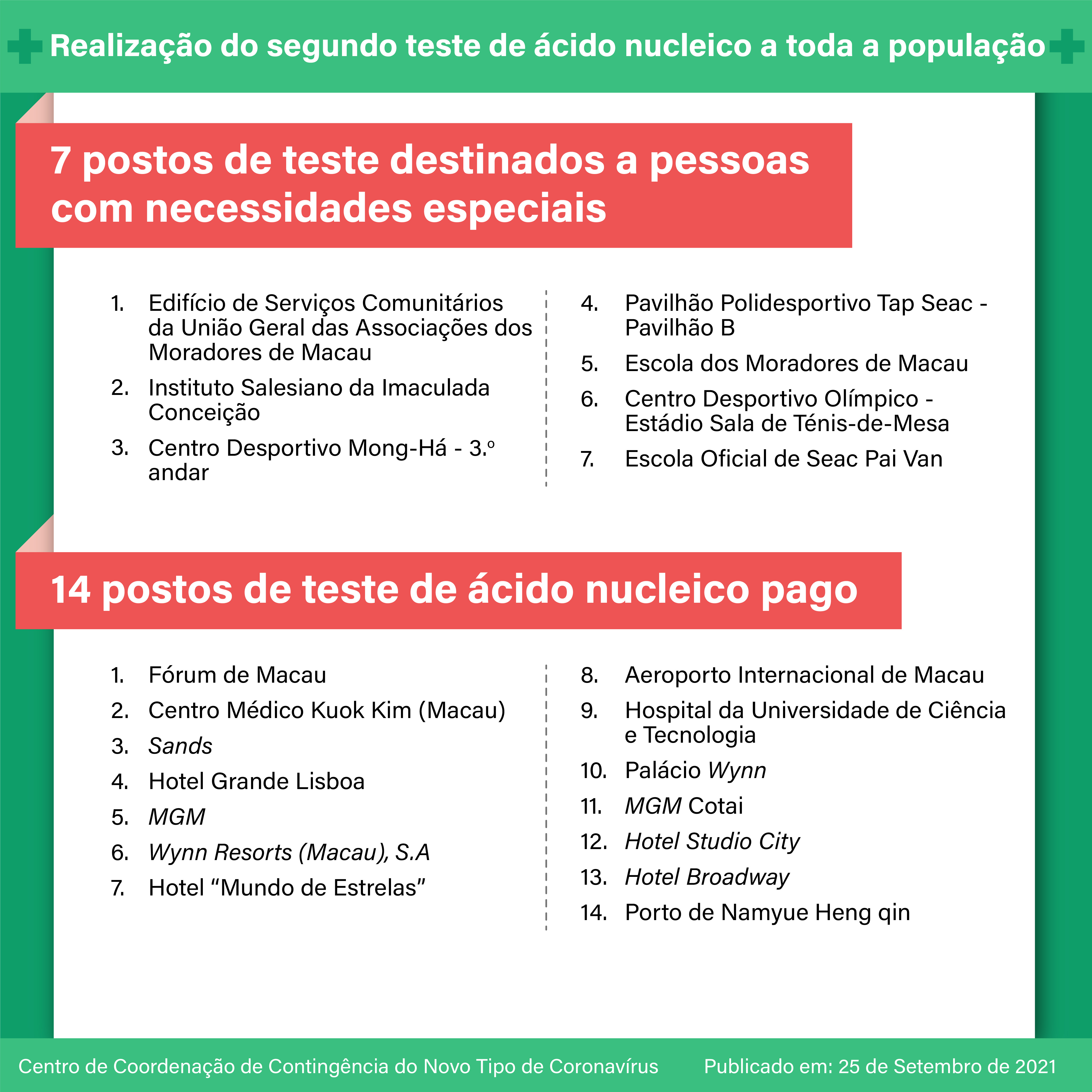 Postos de testes de ácido nucleico para testagem massiva entre 15h00 de 25 de Setembro e 15h00 28 de Setembro de 2021