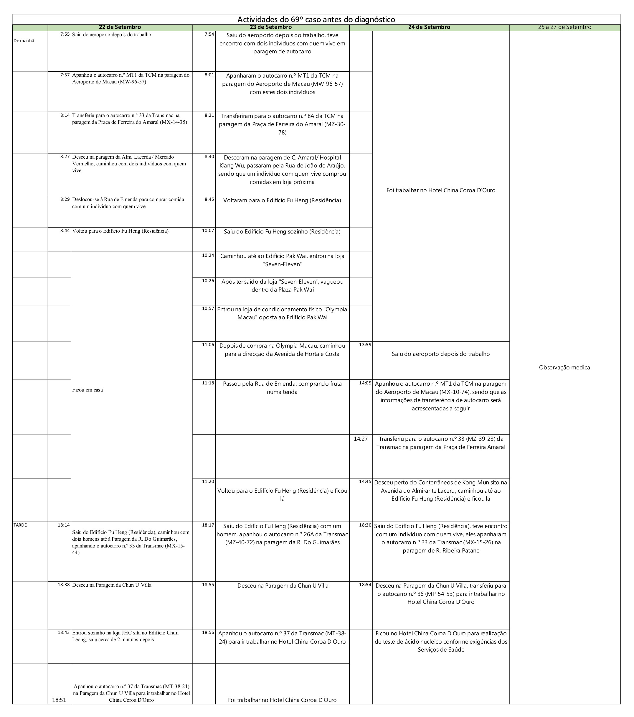 O 69.º caso, homem de 31 anos, com nacionalidade nepalesa, no dia 22 de Setembro, saiu do autocarro na paragem da Alm. Lacerda/ Mercado Vermelho às 08:27, e caminhou com dois indivíduos com quem vive; às 18:14 saiu do Edf. Fu Heng (residência), caminhou com dois homens até à paragem da R. Do Guimarães, apanhando o autocarro n.º 33 da Transmac (MX-15-44); às 18:51 apanhou o autocarro n.º 37 da Transmac (MT-38-24) na paragem da Chun U Villa para ir trabalhar no Hotel China Coroa D’ Ouro;