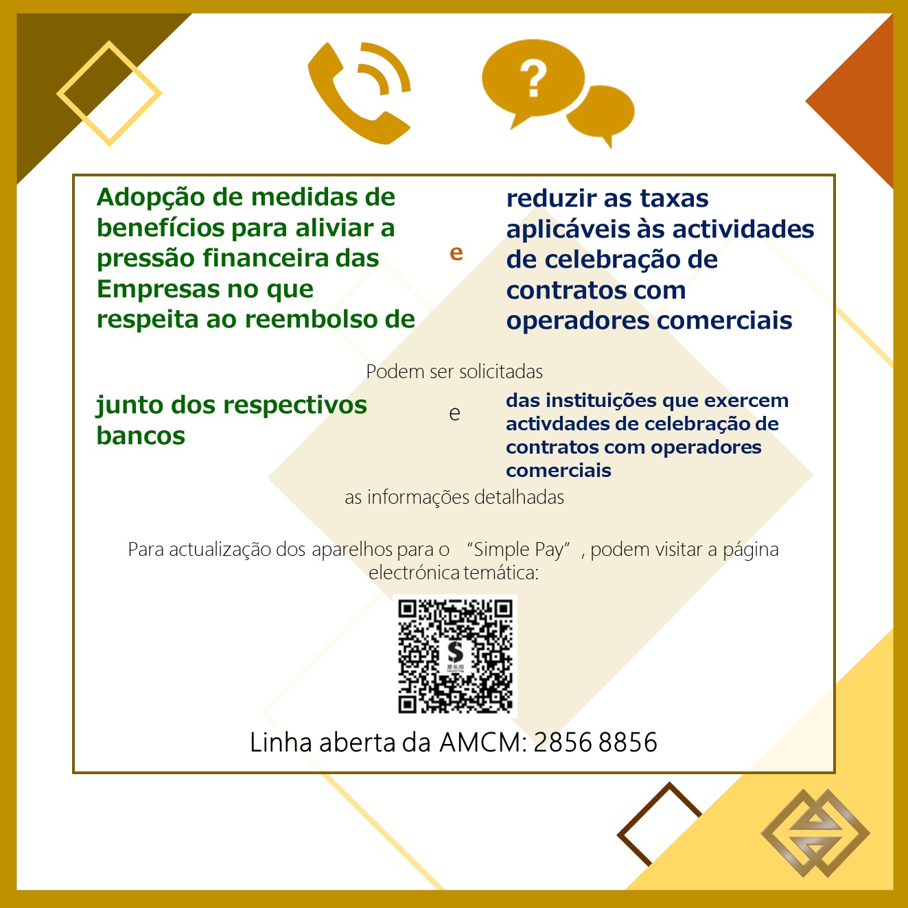 A fim de reduzir as despesas operacionais das PMEs, as instituições que exercem as actividades de celebração de contratos com operadores comerciais e prestam os serviços “Simple Pay” proporcionarão às PMEs uma redução ou um abatimento da taxa de transação no “Simple Pay”. As instituições que exercem actividades de celebração de contratos com operadores tomarão a iniciativa de conceder descontos às PMEs que tenham realizado a actualização dos aparelhos existentes para o “Simple Pay”, por um período de seis meses, ficando dispensadas da necessidade de apresentar qualquer pedido. Os comerciantes que desejam actualizar os seus aparelhos para o “Simple Pay” podem visitar a página electrónica temática ( https://www.amcm.gov.mo/pt/news-and-announcements/simplepay ) ou contractar as respectivas instituições que exercem actividades de celebração de contratos com operadores comerciais.