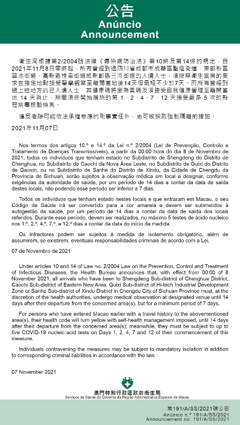 O Centro de Coordenação de Contingência do Novo Tipo de Coronavírus informa que tendo em consideração a evolução epidemiológica mais actualizada das Províncias de Sichuan, os Serviços de Saúde, de acordo com os dispostos nos artigos 10.º e 14.º da Lei n.º 2/2004 (Lei de Prevenção, Controlo e Tratamento de Doenças Transmissíveis), determinam que a partir da 00:00 hora do dia 8 de Novembro de 2021, todos os indivíduos que tenham estado no Subdistrito de Shengdeng do Distrito de Chenghua, no Subdistrito de Caochi da Nova Área Leste, no Subdistrito de Guixi do Distrito de Gaoxin, ou no Subdistrito de Sanhe do Distrito de Xindu, da Cidade de Chengdu da Província de Sichuan, serão sujeitos à observação médica em local a designar, conforme exigências da autoridade de saúde, por um período de 14 dias a contar da data de saída destes locais, não podendo esse período ser inferior a 7 dias.