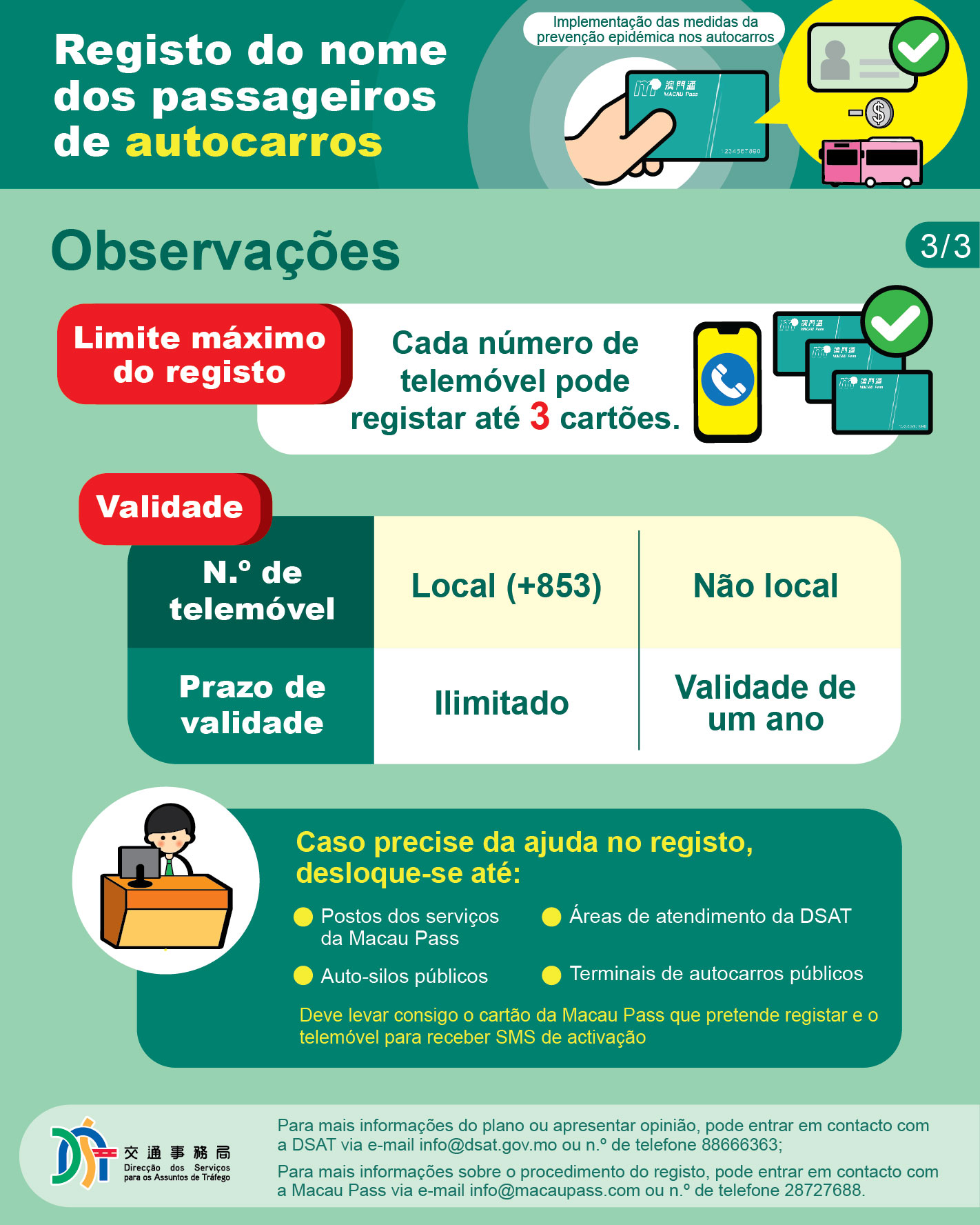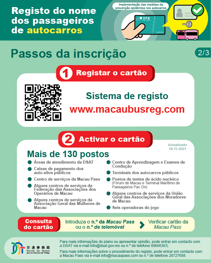 Em articulação com os trabalhos de prevenção epidémica e para facilitar o rastreamento dos passageiros que partilhem os percursos de autocarros com os casos confirmados do novo tipo de coronavírus, o Governo de RAEM, após comunicação e coordenação com a Macau Pass, S.A. e as duas operadoras de autocarros, decidiu implementar o plano de Registo do nome dos passageiros de autocarros, que vem regular o registo de todos os cartões da Macau Pass, utilizados nos autocarros públicos, com o nome do seu proprietário. Caso não seja efectuado o registo dos cartões da Macau Pass, a partir de 11 de Dezembro, os detentores deixarão de poder usufruir dos benefícios das tarifas.