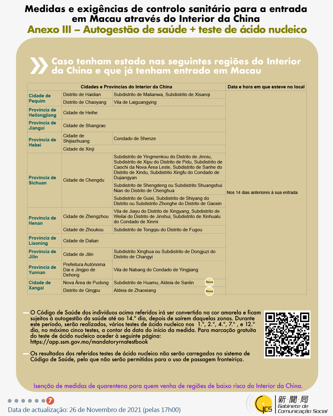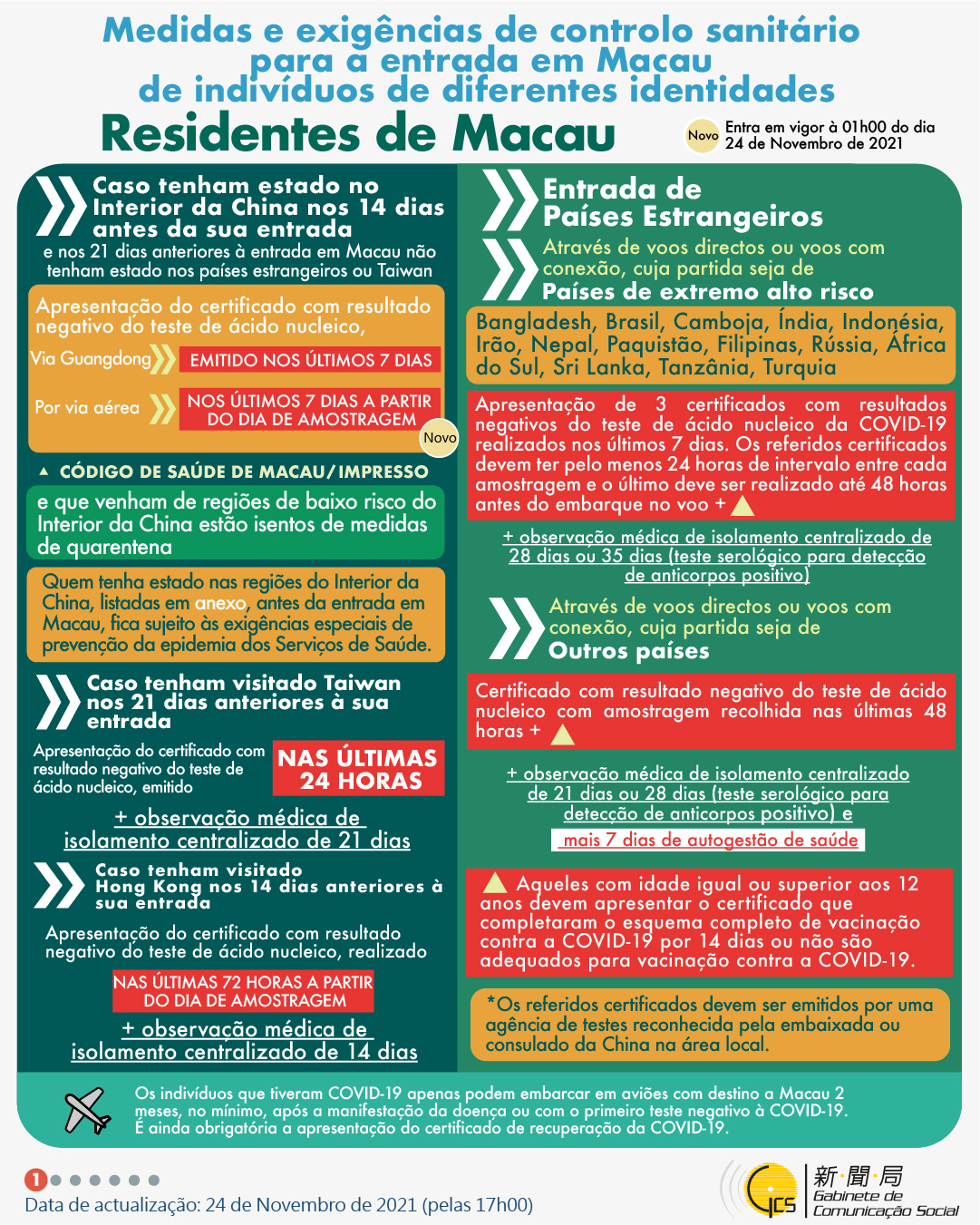 (Infografia)Medidas e exigências de controlo sanitário para a entrada em Macau de indivíduos de diferentes identidades, actualizadas no dia 26 de Novembro de 2021