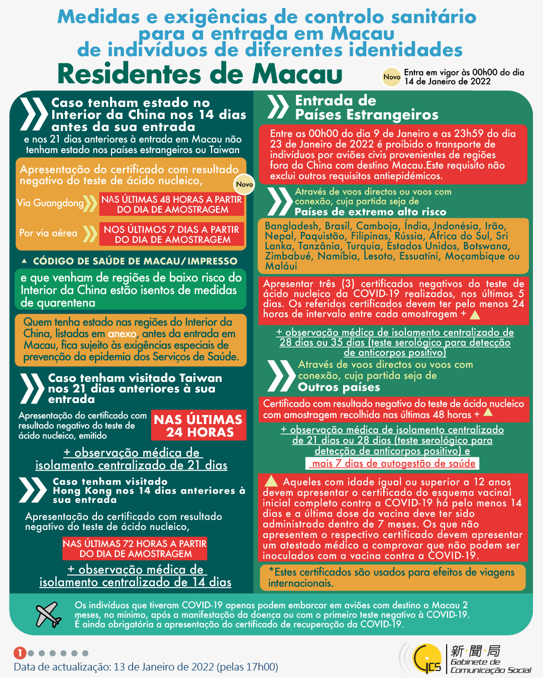 (Infografia)Medidas e exigências de controlo sanitário para a entrada em Macau de indivíduos de diferentes identidades, actualizadas no dia 14 de Janeiro de 2022