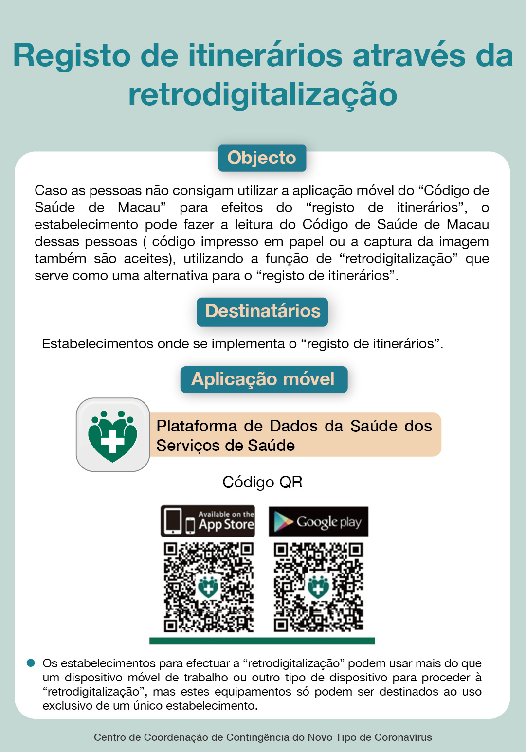 Em caso de investigação epidémica, os Serviços de Saúde vão pedir ao responsável pelo estabelecimento de risco onde o portador de caso positivo esteve, que envie aos Serviços de Saúde os dados registados por“retrodigitalização”. O responsável, nessas situações, deve inserir o número exclusivo do “Código QR” do estabelecimento e a senha enviada pelos Serviços de Saúde e clicar na função de “Carregamento de registo do Código de Saúde digitalizado pelo dispositivo nos últimos 28 dias”, enviar a informação para os Serviços de Saúde.