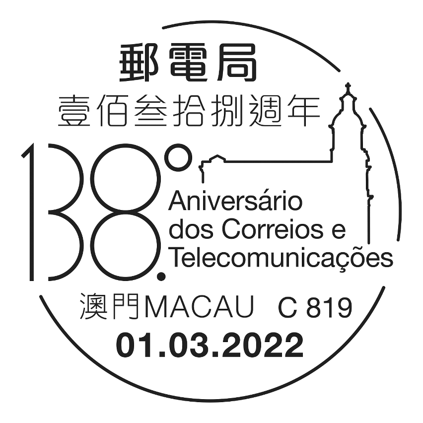 Para assinalar o 138.º Aniversário dos Correios e Telecomunicações, a Direcção dos Serviços de Correios e Telecomunicações informa que no dia 1 de Março de 2022, haverá um Posto de Correio Temporário, com o Carimbo Comemorativo “138.º Aniversário dos Correios e Telecomunicações”, instalado na Loja de Filatelia da Estação Central e na Loja do Museu das Comunicações, com as seguintes horários: