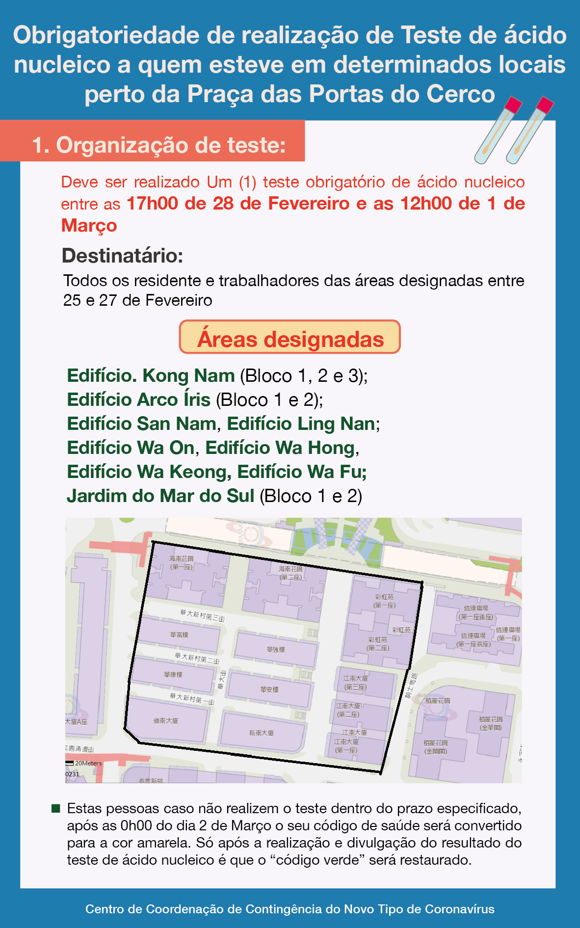 Obrigatoriedade de realização de Teste de ácido nucleico a quem esteve em determinados locais perto da Praça das Portas do Cerco (Infografia)