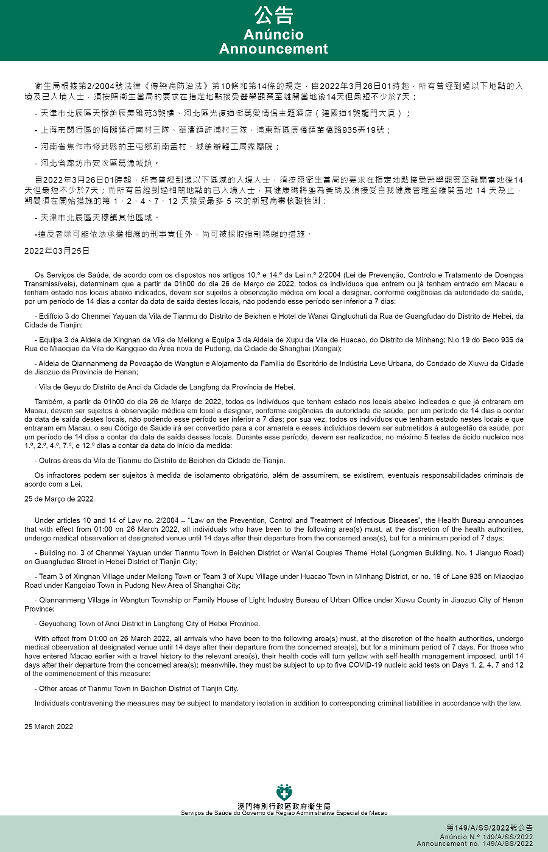Tendo em consideração a evolução epidemiológica mais actualizada no Interior das China, os Serviços de Saúde, de acordo com os dispostos nos artigos 10.º e 14.º da Lei n.º 2/2004 (Lei de Prevenção, Controlo e Tratamento de Doenças Transmissíveis), determinam que a partir da 01h00 do dia 26 de Março de 2022, todos os indivíduos que entrem ou já tenham entrado em Macau e tenham estado nos locais abaixo indicados, devem ser sujeitos à observação médica em local a designar, conforme exigências da autoridade de saúde, por um período de 14 dias a contar da data de saída destes locais, não podendo esse período ser inferior a 7 dias: Edifício 3 do Chenmei Yayuan da Vila de Tianmu do Distrito de Beichen e Hotel de Wanai Qingluchuti da Rua de Guangfudao do Distrito de Hebei, da Cidade de Tianjin; Equipa 3 da Aldeia de Xingnan da Vila de Meilong e Equipa 3 da Aldeia de Xupu da Vila de Huacao, do Distrito de Minhang; N.o 19 do Beco 935 da Rua de Miaoqiao da Vila de Kangqiao da Área nova de Pudong, da Cidade de Shanghai (Xangai); Aldeia de Qiannanmeng da Povoação de Wangtun e Alojamento da Família do Escritório de Indústria Leve Urbana, do Condado de Xiuwu da Cidade de Jiaozuo da Província de Henan; Vila de Geyu do Distrito de Anci da Cidade de Langfang da Província de Hebei.