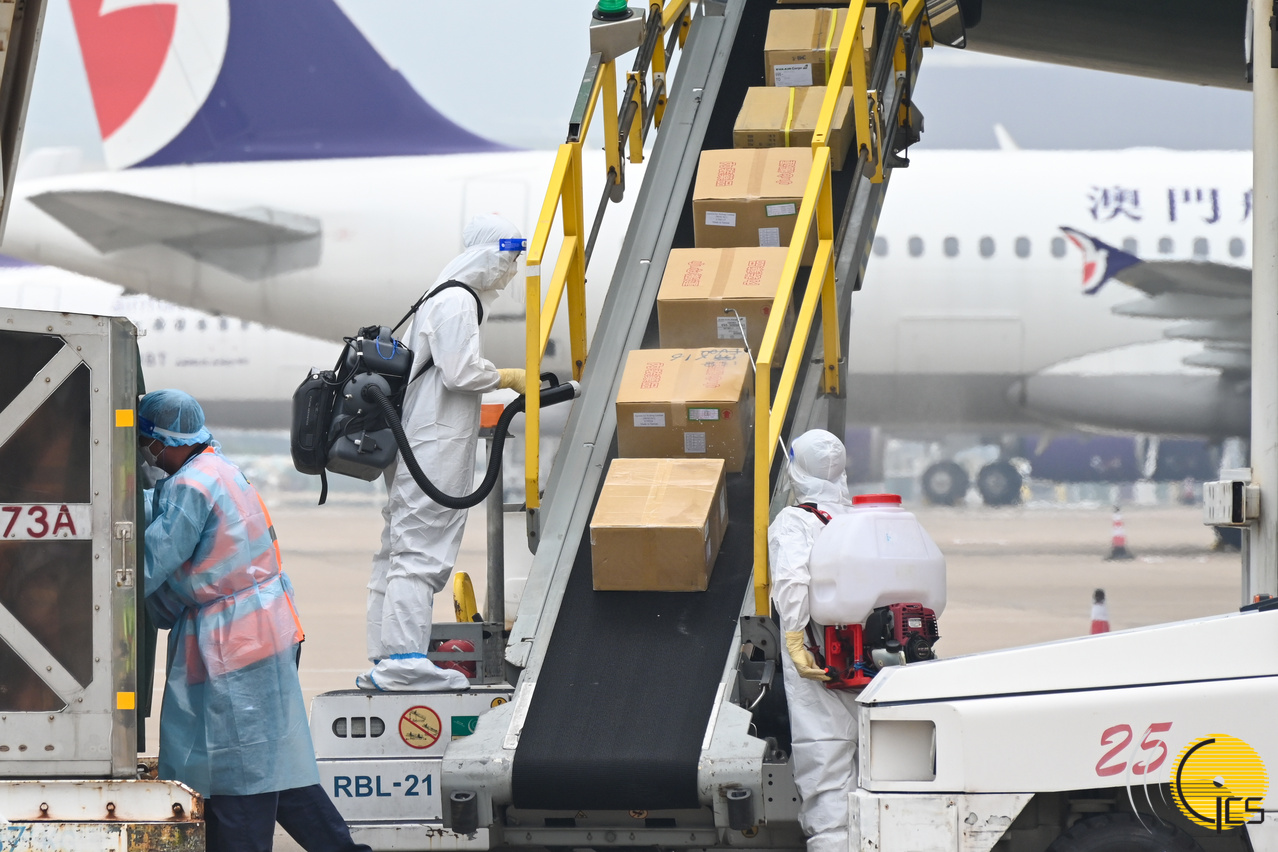 Por sua vez, o responsável da Sociedade do Aeroporto Internacional de Macau apontou que à chegada dos aviões todas as mercadorias transportadas ficam sujeitas a uma desinfecção de vários níveis. Primeiramente, a empresa de limpeza procede à desinfecção da cabina do avião e fecha a saída do mesmo por 10 minutos. Ao fim de 10 minutos é feita a descarga das caixas de mercadoria até ao avental onde é realizada uma nova desinfecção. De seguida, as mercadorias são distribuídas por diversas zonas nos armazéns dos terminais de carga aérea para abertura das embalagens e repetição de mais uma desinfecção. Logo depois é feita a transferência da mercadoria desde a zona de isolamento para a zona verde, que se destina ao armazenamento das mercadorias já desinfectadas, onde a mesma é sujeita à devida sinalização com um autocolante identificativo. Durante todo o procedimento o pessoal responsável usa equipamento de protecção individual e assim que estiver tudo concluído, a zona de descarga de mercadorias é igualmente desinfectada com o intuito de garantir o cumprimento das exigências de prevenção da pandemia.